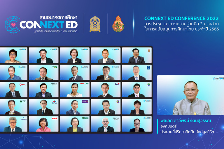 วันที่ 25 พ.ย.2565 ก้าวสู่ปีที่ 6 ของการรวมพลัง สานต่อความมุ่งมั่นขับเคลื่อนการศึกษาไทยให้ก้าวไกลอย่างมั่นคงและยั่งยืน...มูลนิธิสานอนาคตการศึกษา คอนเน็กซ์อีดี นำโดย องคมนตรี พลเอก ดาว์พงษ์ รัตนสุวรรณ ในฐานะประธานที่ปรึกษากิตติมศักดิ์ จัดการประชุม CONNEXT ED Conference 2022 “แนวทางความร่วมมือ 3 ภาคส่วนในการสนับสนุนการศึกษาไทย ประจำปี 2565” ในรูปแบบออนไลน์ โดยมีคณะที่ปรึกษาและผู้ทรงคุณวุฒิจากภาครัฐ โดย รัฐมนตรีว่าการกระทรวงศึกษาธิการ นางสาวตรีนุช เทียนทอง ภาคประชาสังคม และภาคเอกชน โดย นายศุภชัย เจียรวนนท์ ประธานคณะผู้บริหาร เครือเจริญโภคภัณฑ์ ในฐานะประธานกรรมการมูลนิธิฯ พร้อมด้วยซีอีโอ คณะผู้บริหารจากองค์กรผู้ร่วมก่อตั้ง ตลอดจนเครือข่ายพันธมิตร ร่วมกันแลกเปลี่ยนความคิดเห็น หารือและวางแผนการดำเนินงาน โดยเฉพาะด้านการพัฒนาผู้บริหารสถานศึกษาและครูผู้สอน แนวทางเสริมสร้างทักษะซอฟท์สกิลนักเรียน เดินหน้าสร้างเด็กดีมีความสามารถ โดยปีนี้ มูลนิธิฯ ได้เพิ่มเครือข่ายพันธมิตรอีก 3 องค์กรอย่างเป็นทางการ ขยายจาก 12 องค์กรชั้นนำผู้ร่วมก่อตั้ง 19 องค์กรรุ่นที่ 2 และ 13 องค์กรรุ่นที่ 3 เดิม รวมปัจจุบันเป็น 47 องค์กร