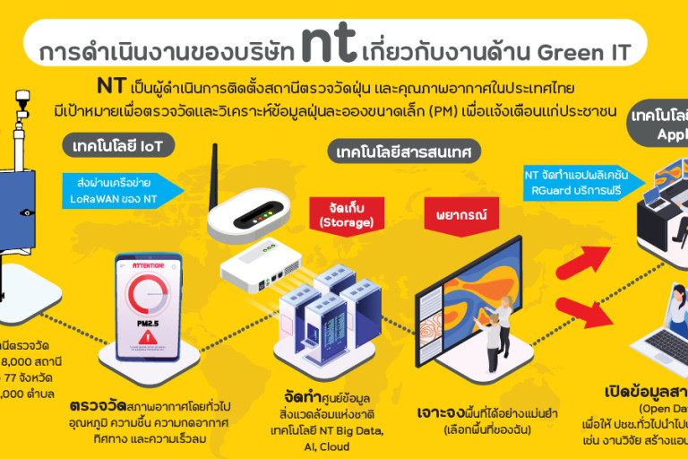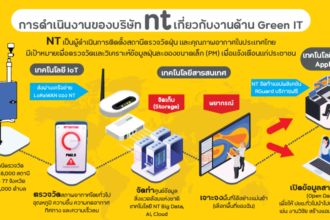 PM 8,000 แห่งทั่วประเทศ เพื่อเตือนภัยและดูแลสุขภาพของประชาชนทั่วประเทศ พร้อมเปิดให้หน่วยงานใช้ประโยชน์จากข้อมูลโดยไม่มีค่าใช้จ่าย ซึ่ง NT ได้รับมอบหมายจากกระทรวงดิจิทัลเพื่อเศรษฐกิจและสังคม (ดีอีเอส) โดยกองทุนพัฒนาดิจิทัลเพื่อเศรษฐกิจและสังคม ได้มอบทุนอุดหนุนการวิจัยให้ NT เป็นผู้ดำเนินการจัดทำศูนย์ข้อมูลสิ่งแวดล้อมแห่งชาติ พร้อมทั้งติดตั้งสถานีตรวจวัดฝุ่น PM 8,000 แห่ง ครอบคลุมพื้นที่กว่า 5,000 ตำบล ใน 900 อำเภอทั่วประเทศ ซึ่งดำเนินการเสร็จเรียบร้อยแล้ว โดยมีเป้าหมายเพื่อตรวจวัดและวิเคราะห์ข้อมูลฝุ่นละอองขนาดเล็ก (PM) รวมถึงส่งข้อมูลแจ้งเตือนประชาชนแบบเรียลไทม์ผ่านทางแอปพลิเคชัน RGuard ที่ใช้ได้ฟรี