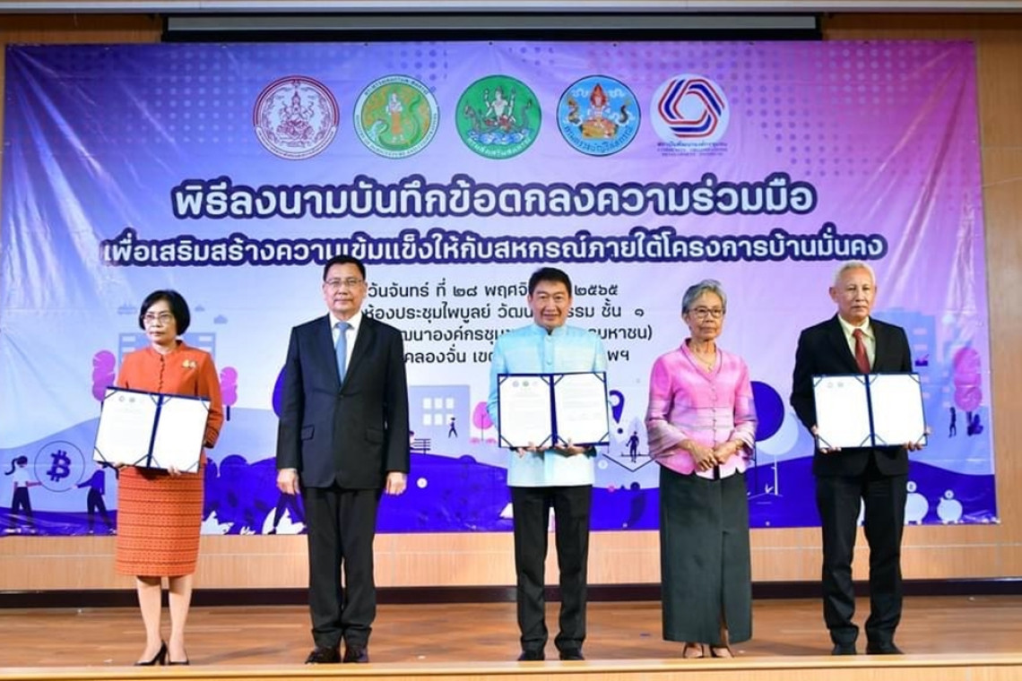 กระทรวงเกษตรและสหกรณ์ โดยกรมส่งเสริมสหกรณ์ และกรมตรวจบัญชีสหกรณ์ ได้ลงนามบันทึกความร่วมมือกับ พอช. ซึ่งเป็นหน่วยงานภายใต้การกำกับดูแลของกระทรวงการพัฒนาสังคมและความมั่นคงของมนุษย์ เพื่อบูรณาการความร่วมมือระหว่าง 3 หน่วยงาน ในการเสริมสร้างความเข้มแข็งให้กับสหกรณ์ภายใต้โครงการบ้านมั่นคงทั่วประเทศ ซึ่งเป็นองค์กรชุมชนที่ใช้สหกรณ์เป็นเครื่องมือในการแก้ไขปัญหาที่อยู่อาศัยชุมชน ผู้มีรายได้น้อย โดยการมีส่วนร่วมจากองค์กรชุมชนที่ดำเนินโครงการบ้านมั่นคง ในการส่งเสริมสนับสนุนการจัดตั้งสหกรณ์ ที่สอดคล้องกับเจตนารมณ์ของโครงการบ้านมั่นคง รวมถึงการส่งเสริมสนับสนุนให้เกิดการจัดทำระบบบัญชีตามมาตรฐานการบัญชีที่นายทะเบียนสหกรณ์กำหนด เพื่อให้สหกรณ์สามารถบริหารจัดการและดำเนินธุรกิจของสหกรณ์ได้อย่างมีประสิทธิภาพ มีธรรมาภิบาล ระยะเวลาดำเนินการ 3 ปี นับตั้งแต่วันที่ลงนามในบันทึกข้อตกลงความร่วมมือ