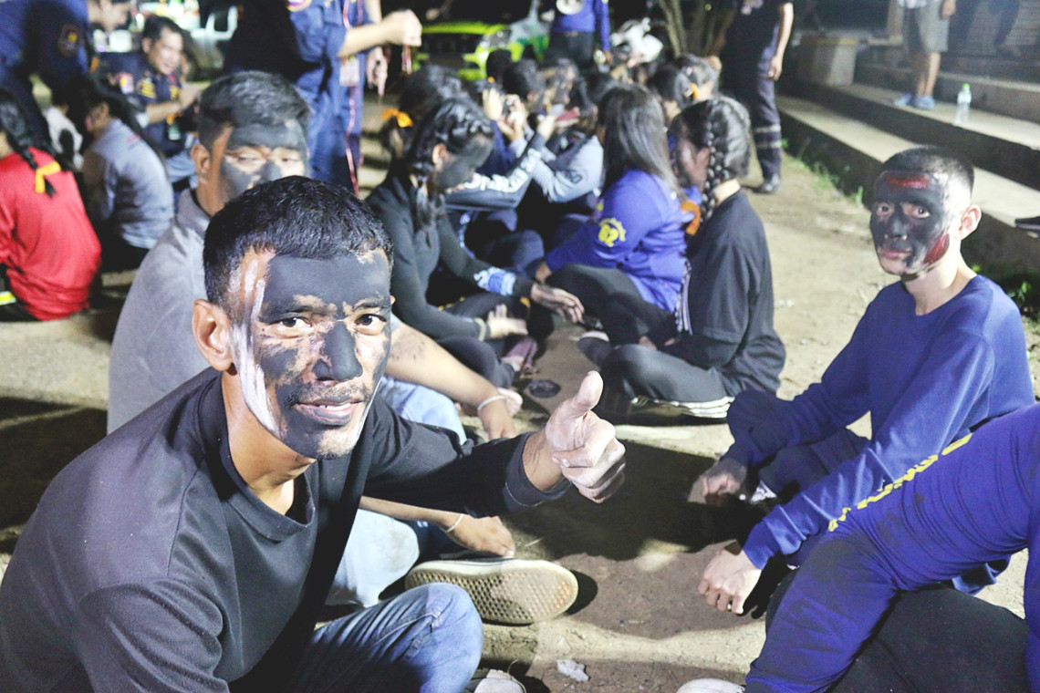 ทั้งนี้ นายพิชิต เกลียกกุทัณฑ์ หัวหน้าหน่วยกู้ภัยมูลนิธิสว่างโรจนธรรมสถานสัตหีบ พร้อมเจ้าหน้าที่หน่วยกู้ภัยจำนวนหนึ่ง ได้พาอาสาสมัครหน่วยกู้ภัยที่เข้าสมัครใหม่ จำนวน 50 คน พร้อมอาสาสมัครรุ่นพี่อีก 200 กว่านาย เดินทางไปที่สุสานหรือป่าช้าบ้านมาบฟักทอง ต.ห้วยใหญ่ อ.บางละมุง จ.ชลบุรี พร้อมอุปกรณ์พรางหน้าของทหารมาพรางหน้าของอาสาสมัครกู้ภัยใหม่ โดยมีฐานกิจกรรมจำนวนมาก ล้วนแล้วมีแต่ความยากลำบาก ต้องเปรอะเปื้อนไปทั้งตัว และยังมีการฝึกวัดจิตใจในรูปแบบต่างๆ คล้ายกับการฝึกของทหาร แต่เป็นที่น่าแปลกใจอย่างมาก วัยรุ่นทุกคนสมัครใจ เต็มใจ และสนใจกับการฝึกทดสอบจิตใจในครั้งนี้เป็นอย่างมาก