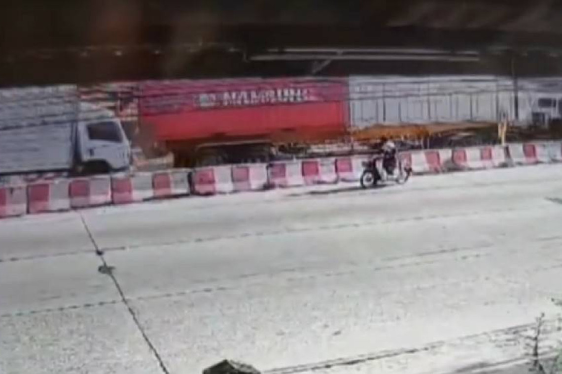 เมื่อเวลา 16.30 น.วันที่ 14 ธ.ค.65 ภาพกล้องวงจรปิดข้างทาง จะเห็นรถวิ่งบนถนนจำนวนมากจู่ๆ มีรถ จยย.ชะลอจะเลี้ยวข้ามทาง รถพ่วงที่ตามมาเบรกกระทันหัน รถบรรทุกตู้ทึบที่วิ่งตามมาพุ่งเข้าชนด้านท้ายอย่างแรง จนคนขับติดภายใน