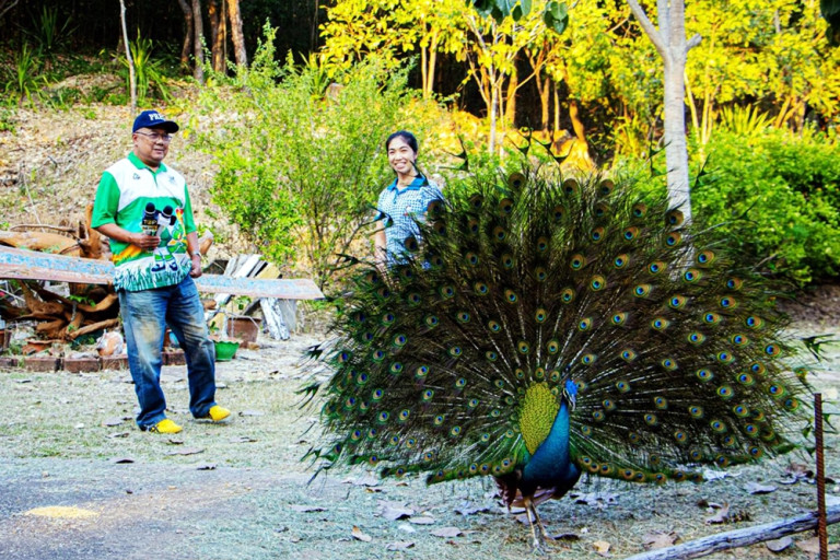 พระครูพิริยสาธุกิจ เจ้าคณะตำบลเขาทราย รองเจ้าอาวาสวัดพระพุทธบาทเขาทราย เล่าให้ฟังว่า ในช่วงเช้าและช่วงเย็น ในช่วงนี้เป็นฤดูการผสมพันธุ์ นกยูงตัวผู้จะรำแพนเพื่อโชว์ความสง่างามให้นกตัวเมียสนใจ ซึ่งจะทำให้เห็นความงดงามของขนนูกยูงที่รำแพนอวดนักท่องเที่ยวให้สามารถเข้าใกล้และถ่ายภาพเป็นที่ระลึกได้จึงทำให้ฝูงนกยูงที่วัดเขาทรายแห่งนี้กลายเป็นสิ่งดึงดูดให้นักท่องเที่ยวที่ชอบธรรมชาติได้มาสัมผัสอย่างใกล้ชิดอีกด้วย