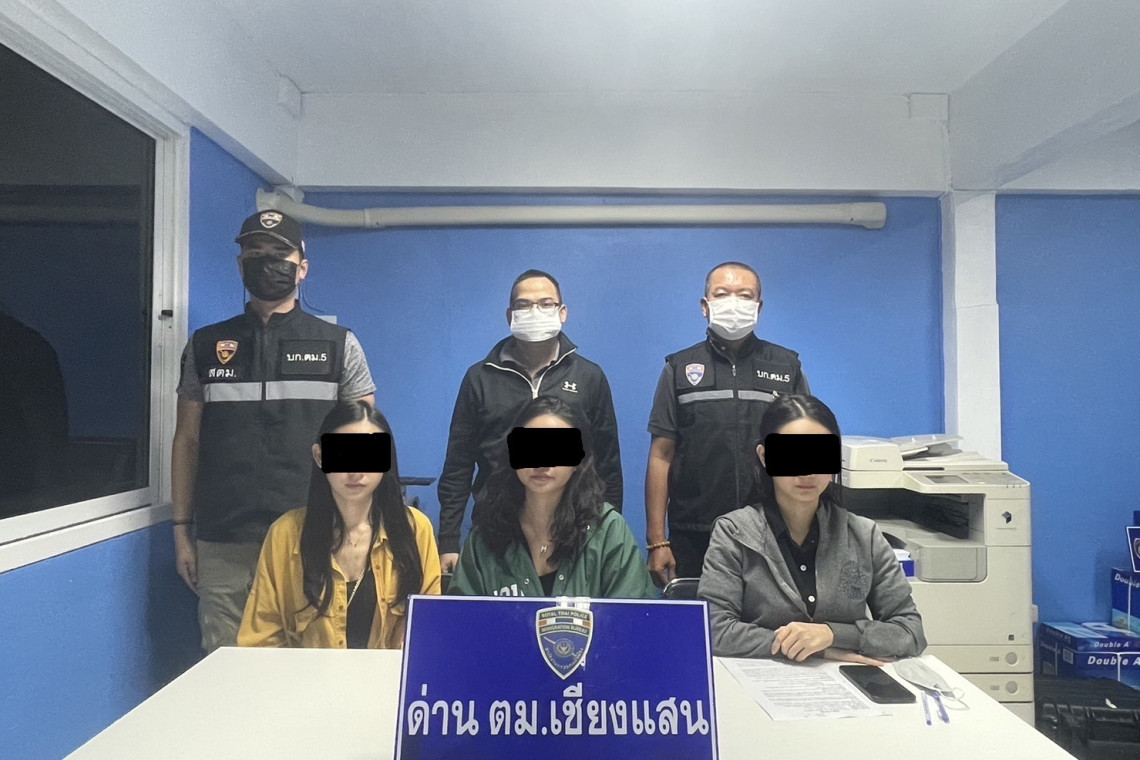 วันที่ 17 ธ.ค.2565 เจ้าหน้าที่ด่านตรวจคนเข้าเมืองเชียงแสน ได้ประสานงานร่วมกับ ด่านตรวจคนเข้าเมืองเชียงราย กองบังคับการตรวจคนเข้าเมือง 5 ภายใต้การอำนวยการของ พ.ต.อ.มณุวัฒน์ กอสนาน ผกก.ด่าน ตม.เชียงแสน จ.เชียงราย พ.ต.ท.หญิง จารุวรรณ วงษ์สุวรรณ สว.ด่าน ตม.เชียงแสน พ.ต.ท.ณัฐวัตร มิตรคุณ สารวัตรด่าน ตม.เชียงแสน พ.ต.ต.ปรเมศร์ ศรีนนท์ สว.(สอบสวน) กก.สส.บก.ตม.5 พ.ต.ต.ณัฐนนท์ เปียแก้ว สว.กก.สส.บก.ตม.5 พร้อมด้วยเจ้าหน้าที่ด่านตรวจคนเข้าเมืองเชียงราย เจ้าหน้าที่งานสืบสวน สภ.บ้านดู่ จ.เชียงราย ได้ร่วมกันจับกุม นางชาร์ชานหลิงอายุ 26 ปี สัญชาติเมียนมา นางเหวนถี่ท๋อง อายุ 26 ปี สัญชาติเวียดนาม นางหยินจ้ายหลาน อายุ 27 ปี สัญชาติเมียนมา ในข้อกล่าวหาว่า “ใช้ดวงตรา รอยตรา หรือแผ่นปะตรวจลงตราที่ทำขึ้นปลอม” ตามประมวลกฎหมายอาญา และ “เป็นคนต่างด้าวเข้ามาในราชอาณาจักรโดยการอนุญาตสิ้นสุด ตาม พ.ร.บ.คนเข้าเมือง พ.ศ.2522”