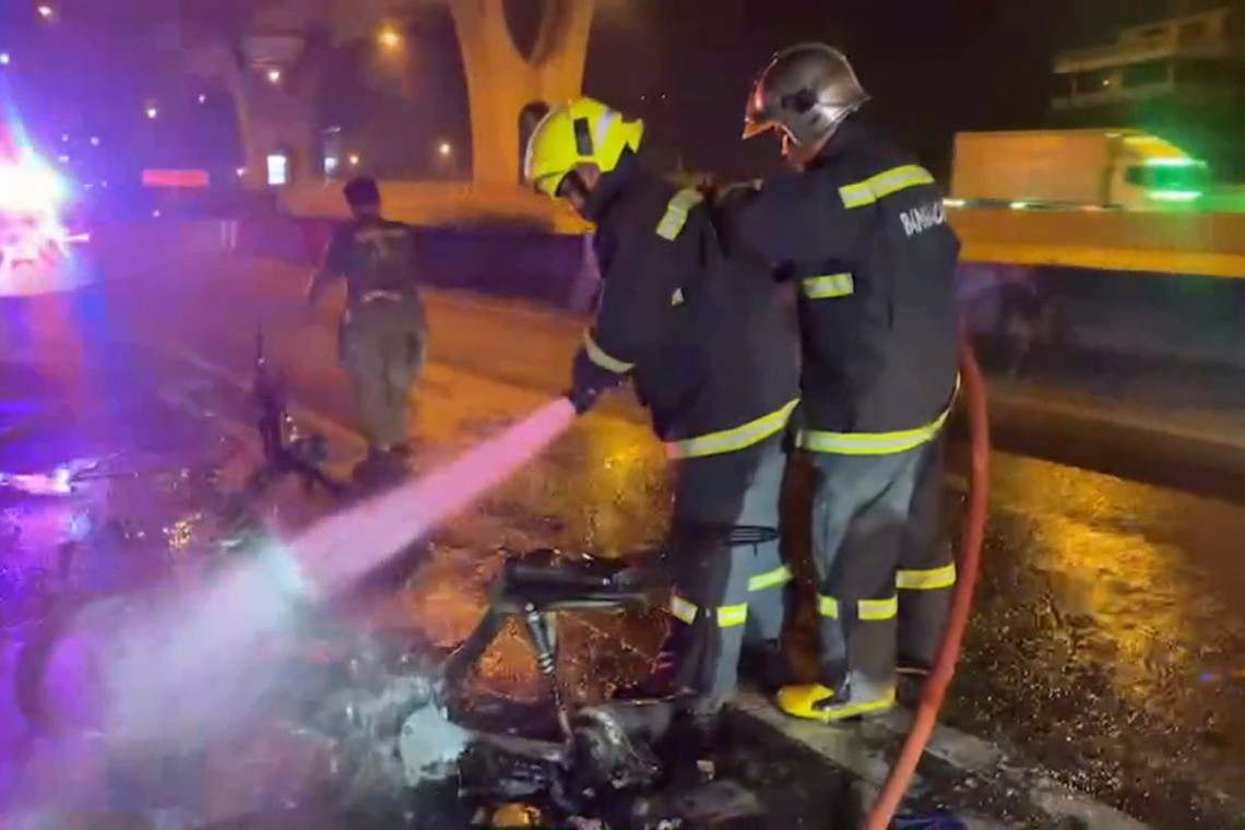 วันที่ 20 ธันวาคม 2565 เวลา 19.30 น. เจ้าหน้าที่ตำรวจ สภ.บางบ่อ สมุทรปราการ ได้รับแจ้งมีเหตุไฟไหม้รถจักรยานยนต์ บนถนนเทพรัตน (บางนา-ตราด) ขาออก ช่องทางคู่ขนาน บริเวณเชิงทางลงสะพานกลับรถ หลักกิโลเมตรที่ 26 ตำบลบางบ่อ อำเภอบางบ่อ จังหวัดสมุทรปราการ หลังรับแจ้งจึงรีบไปตรวจสอบพร้อมด้วยรถดับเพลิง อบต.บางเสาธง อบต.บางบ่อ และอาสาสมัครมูลนิธิร่วมกตัญญู เดินทางตรวจสอบที่เกิดเหตุ