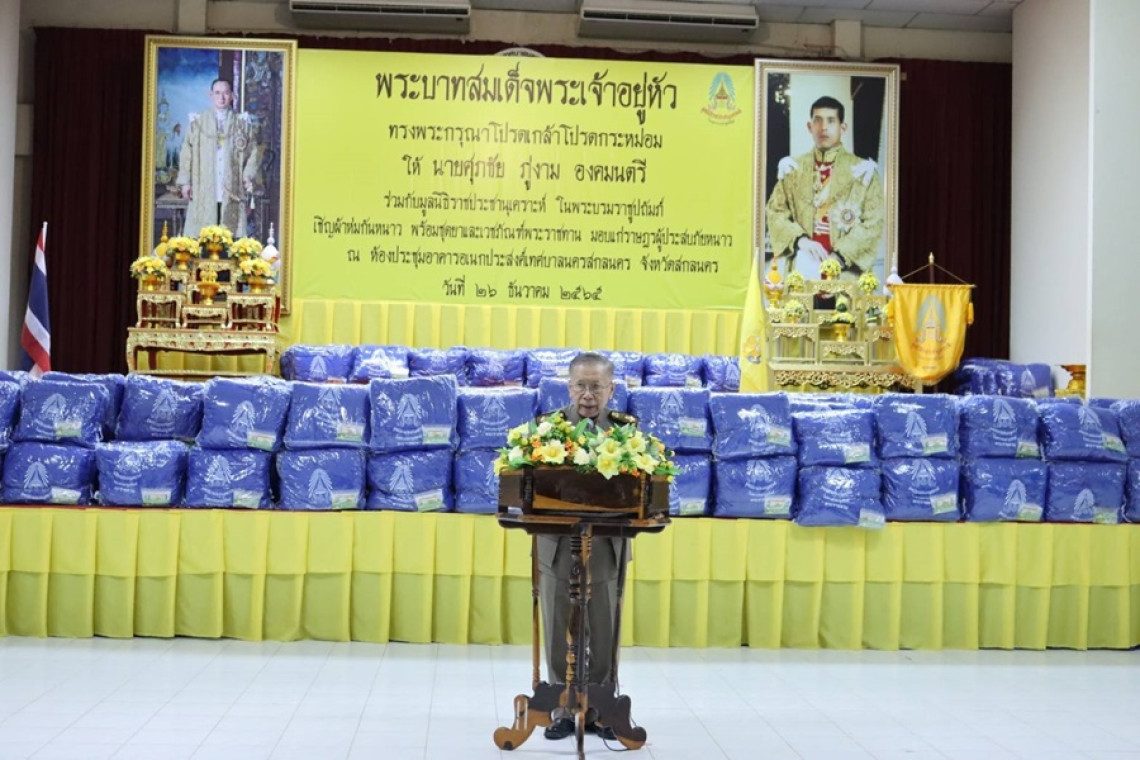 ต่อจากนั้น เวลา 12.40 น. น. พระบาทสมเด็จพระเจ้าอยู่หัว ทรงพระกรุณาโปรดเกล้าโปรดกระหม่อมให้นายศุภชัย ภู่งาม องคมนตรี ร่วมกับมูลนิธิราชประชานุเคราะห์ ในพระบรมราชูปถัมภ์ เชิญผ้าห่มกันหนาว จำนวน 3,000 ผืน และชุดยาสามัญประจำบ้านพระราชทาน ไปมอบแก่ราษฎรที่ประสบภัยหนาวในพื้นที่จังหวัดสกลนคร เพื่อช่วยบรรเทาความเดือดร้อนในเบื้องต้น โดยมอบแก่ผู้ว่าราชการจังหวัด และนายอำเภอ 4 อำเภอ ประกอบด้วย นายอำเภอเมืองสกลนคร นายอำเภอพรรณนานิคม นายอำเภอโคกศรีสุพรรณ นายอำเภอโพนนาแก้ว และนายอำเภอเต่างอย ซึ่งเป็นตัวแทนราษฎรเพื่อเชิญไปมอบแก่ราษฎรในแต่ละพื้นที่ต่อไป และมอบแก่ราษฎรในพื้นที่อำเภอเมืองสกลนคร ณ หอประชุมเทศบาลนครสกลนคร อำเภอเมืองสกลนคร จังหวัดสกลนคร