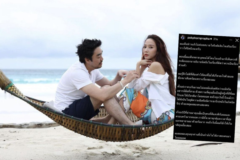 ผมรู้สึกไม่ดีที่ต้องทำให้คนที่ไม่ได้เกี่ยวอะไรด้วยเลยต้องมาเดือดร้อนเพราะเรื่องของผม ตั้งแต่เราคบกันมาผมไม่เคยมีแม้แต่คิดว่าจะมีหรืออยากมีมือที่สาม ด้วยความที่คุณอั้มเป็นผู้หญิงที่ดีที่ผมรักและให้เกียรติมาโดยตลอด จนถึงทุกวันนี้ ถึงแม้เรา ได้ตัดสินใจยุติความสัมพันธ์มาระยะนึง (หลังวันเกิดนิดนึง) ด้วยเหตุผลของคนสองคน