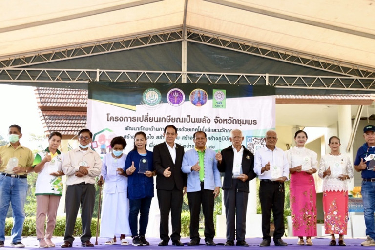นายนิรัช โอบอ้อม ปลัดอำเภอละแม กล่าวว่า ในนามของ จ.ชุมพร ขอขอบคุณ วช. และ มหาวิทยาลัยแม่โจ้-ชุมพร ที่ได้จัดให้มีโครงการเปลี่ยนเกษียณเป็นพลังขึ้น จ.ชุมพรเป็นเมืองเกษตรกรรม และอุดมไปด้วยผลผลิตทางการเกษตร ซึ่งโครงการดังกล่าวจะเป็นการสร้างแรงจูงใจของกลุ่มผู้สูงอายุในการพัฒนาทักษะด้านการเกษตร และส่งเสริมการประกอบอาชีพด้วยเทคโนโลยีและนวัตกรรมการเกษตรสมัยใหม่ สร้างกลไกในการเตรียมความพร้อมเข้าสู่สังคมสูงวัยของ จ.ชุมพร