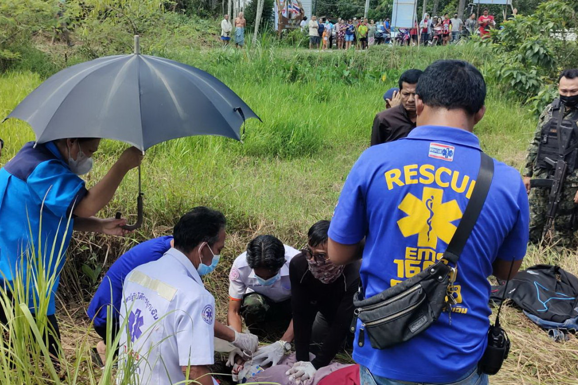 หลังจากลงพื้นที่ไปตรวจสอบจุดเกิดเหตุร่วมกับหน่วยกู้ชีพเจดีย์ทอง และกู้ชีพจะโหนง พบรถไฟซึ่งเป็นรถด่วนขบวน 37 สถานีกลางกรุงเทพฯอภิวัฒน์-สุไหงโกลก จอดอยู่บนรางรถไฟหัวรถจักรเสียหายเล็กน้อย ส่วนโบกี้รถไฟไม่เป็นอะไรรวมทั้งผู้โดยสารและเจ้าหน้าที่ปลอดภัย โดยชนกับรถยนต์กระบะโตโยต้าสีบรอนสี่ประตู ทะเบียน นราธิวาส ซึ่งกระเด็นตกไปอยู่ในคูริมทางรถไฟห่างจากจุดที่ชนประมาณ 30เมตร สภาพตัวรถด้านขวาถูกชนพังเสียหาย และมีผู้บาดเจ็บติดอยู่ภายในรถ 2 คน เป็นผู้ชายซึ่งเป็นคนขับ และผู้หญิงที่นั่งข้างๆ นอกจากนี้ยังมีผู้หญิงที่กระเด็นหลุดออกจากรถไปนอนกองอยู่ในพงหญ้าอีก1คน และบาดเจ็บหนักที่สุด และยังมีรถจักรยานยนต์ฮอนด้าสกู๊ปี ทะเบียน สงขลา ที่บรรทุกมาบนท้ายรถกระบะกระเด็นหลุดออกจากรถมากองอยู่ในพงหญ้าอีก1คัน พร้อมกระเป๋าสัมภาระที่บรรทุกมาท้ายรถกระบะ