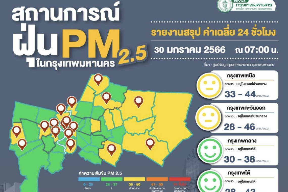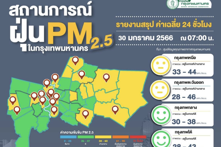 ศูนย์ข้อมูลคุณภาพอากาศกรุงเทพมหานครรายงานสถานการณ์ฝุ่นละอองขนาดไม่เกิน 2.5 ไมครอน (PM 2.5) ของสถานีตรวจวัดคุณภาพอากาศของกรุงเทพมหานคร ประจำวันจันทร์ที่ 30 มกราคม พ.ศ. 2566 เวลา 07.00 น. ค่าเฉลี่ย 24 ชั่วโมง ของฝุ่นละอองขนาดไม่เกิน 2.5 ไมครอน (PM2.5) ตรวจวัดได้ 24-46 ไมโครกรัม/ลูกบาศก์เมตร(มคก./ลบ.ม.) พบว่าไม่เกินมาตรฐานทุกพื้นที่ที่มีการตรวจวัด (มาตรฐานไม่เกิน 50 มคก./ลบ.ม.) ดัชนีคุณภาพอากาศของสถานีตรวจวัดของกรุงเทพมหานคร ส่วนใหญ่อยู่ในระดับคุณภาพอากาศดี