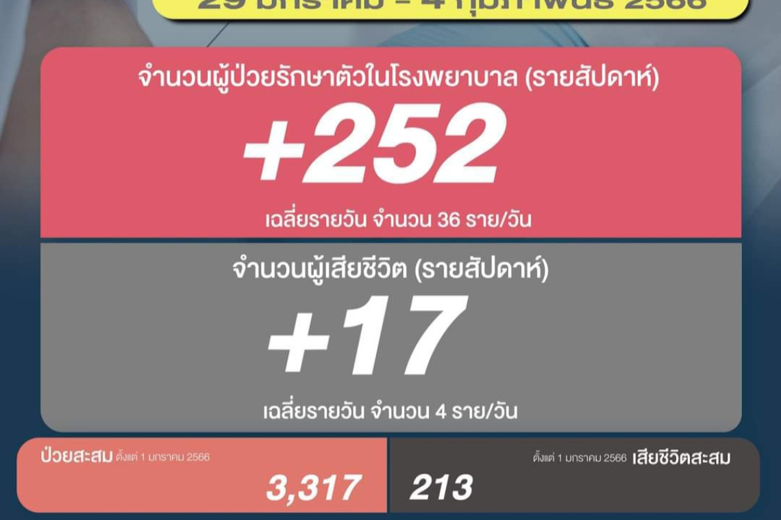 วันที่ 6 ก.พ.2566 ศูนย์ข้อมูล COVID-19 กรมประชาสัมพันธ์ รายงานสถานการณ์โรคโควิด-19 รายสัปดาห์ เกาะติดยอดผู้ติดเชื้อโควิด-19 รายสัปดาห์ ระหว่างวันที่ 29 มกราคม - 4 กุมภาพันธ์ 2566 พบผู้ป่วยรักษาตัวในโรงพยาบาล (รายสัปดาห์) จำนวน 252 ราย : เฉลี่ยรายวัน จำนวน 36 ราย/วันผู้เสียชีวิต (รายสัปดาห์) จำนวน 17 ราย : เฉลี่ยรายวัน จำนวน 4 ราย/วัน ทั้งนี้พบยอดป่วยสะสม 3,317 ราย (ตั้งแต่ 1 มกราคม 2566)เสียชีวิตสะสม 213 ราย (ตั้งแต่ 1 มกราคม 2566)