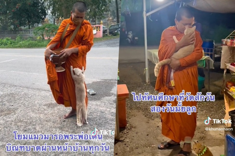 เป็นอีกเรื่องราวที่สร้างรอยยิ้มในโลกออนไลน์ เมื่อสมาชิก TikTok@khunaonaon โพสต์คลิปเหมียวน้อยยืนเกาะจีวรพระที่มาบิณฑบาต พร้อมเขียนแคปชั่นว่า "โยมแมวชาเย็น กับ พระพ่อ"