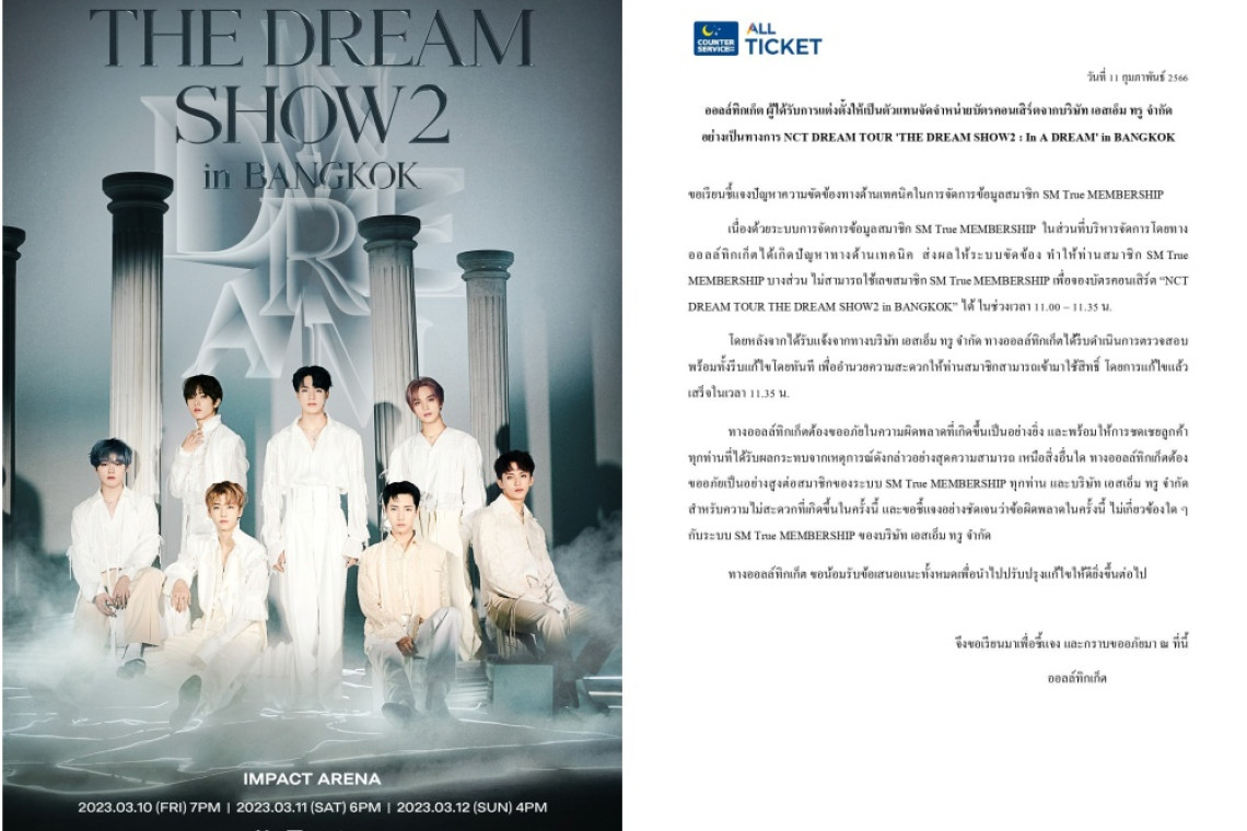เนื่องด้วยระบบการจัดการข้อมูลสมาชิก SM Tre MEMBERSHIP ในส่วนที่บริหารจัดการโดยทางออลล์ทิกเก็ตได้เกิดปัญหาทางด้านเทคนิค ส่งผลให้ระบบขัดข้อง ทำให้ท่านสมาชิก SM True MEMBER SHIP บางส่วน ไม่สามารถใช้เลขสมาชิก SM True MEMBERSHIP เพื่อจองบัตรคอนเสิร์ต “NCT DREAM TOUR THE DREAM SHOW2 in BANGKOK” ได้ ในช่วงเวลา 11.00-11.35 น.
