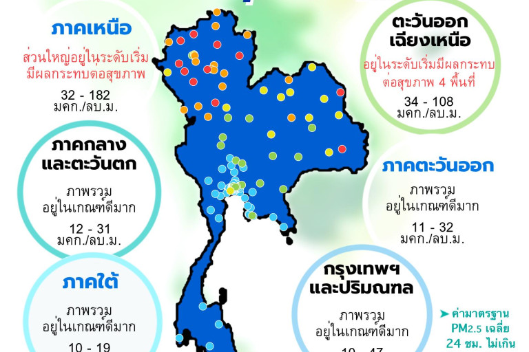 ภาคเหนือ เกินค่ามาตรฐานเป็นส่วนใหญ่ ตรวจวัดได้ 32 - 182 มคก./ลบ.ม.
