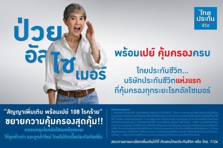 ไทยประกันชีวิตพัฒนานวัตกรรมสินค้าขยายความคุ้มครองโรคอัลไซเมอร์ครอบคลุมทุกระยะของโรคเป็นแห่งแรก ทั้งลูกค้าเดิมและลูกค้าใหม่ที่ซื้อสัญญาเพิ่มเติมประกันสุขภาพ “ไทยประกันชีวิต พร้อมเพย์ 108 โรคร้าย” โดยไม่คิดเบี้ยฯ เพิ่ม ขานรับการก้าวสู่สังคมผู้สูงอายุของไทย