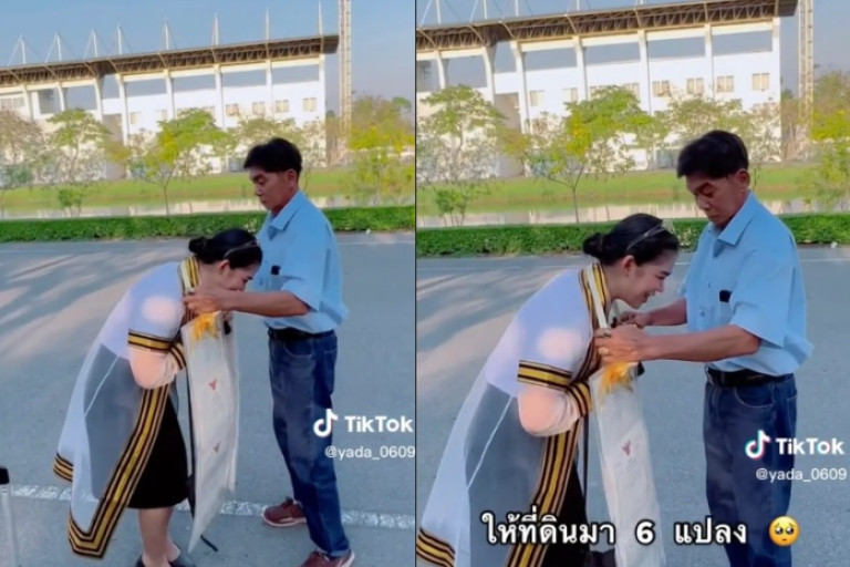 โดย สาวเจ้าของคลิป เขียนแคปชั่น #ลูกชาวนา #รับปริญา พร้อมข้อความในคลิปเล่าว่า "ฉันมีพ่อที่ไม่เคยบอกรัก วันรับปริญญาก็บอกว่าไม่มีอะไรให้นะ แค่จะมารับกลับบ้าน แต่ให้ที่ดินมา 6 แปลง ทีแรกคิดว่าได้เท่านี้จริงๆ แต่โดนพ่อซ้อนแผน 2 รอบ ร้องไห้หนักมาก"