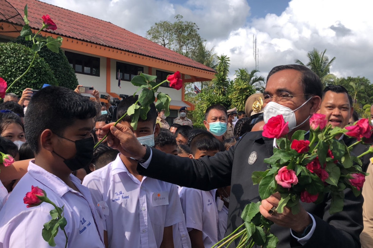 ทั้งนี้ทันทีที่เดินทางถึงได้มีการแสดงเต้นบาสโลบต้อนรับนายกฯและคณะ ขณะที่บรรยากาศ ณ ที่ว่าการอำเภอจุฬาภรณ์ เป็นไปอย่างคึกคัก ประชาชนและนักเรียนในพื้นที่ใกล้เคียงเดินทางมาร่วมต้อนรับ ถือป้ายให้กำลังใจจำนวนมาก อาทิ ‘รักลุงเสมอ’ ‘เทหมดหน้าตักให้ลุงตู่’ ‘คนใต้รักนายกประยุทธ์ จันทร์โอชา‘ ‘นายกคนนี้โถกรัดดวงโหม๋เราจ้าน’ ‘ให้ทั้งใจและคะแนน’ สู้ สู้ คนจุฬาภรณ์เป็นกำลังใจให้ลุงตู่’ ‘ลุงตู่ที่หนึ่งในใจเรา’ ‘คนใต้รักใครรักจริง’