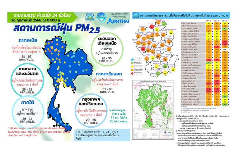 วันที่ 26 กุมภาพันธ์ 2566 เวลา 07.00 น.ผู้สื่อข่าวรายงาน ว่า เพจเฟซบุ๊ก ศูนย์แก้ไขปัญหามลพิษทางอากาศ ระบุภาพรวมปริมาณ PM2.5 ในประเทศพบเกินค่ามาตรฐานใน จ.นนทบุรี กรุงเทพฯ จ.เชียงราย จ.เชียงใหม่ จ.แม่ฮ่องสอน จ.พะเยา จ.น่าน จ.ลำพูน จ.ลำปาง จ.แพร่ จ.อุตรดิตถ์ จ.สุโขทัย จ.พิษณุโลก จ.ตาก จ.ราชบุรี และ จ. ตราด