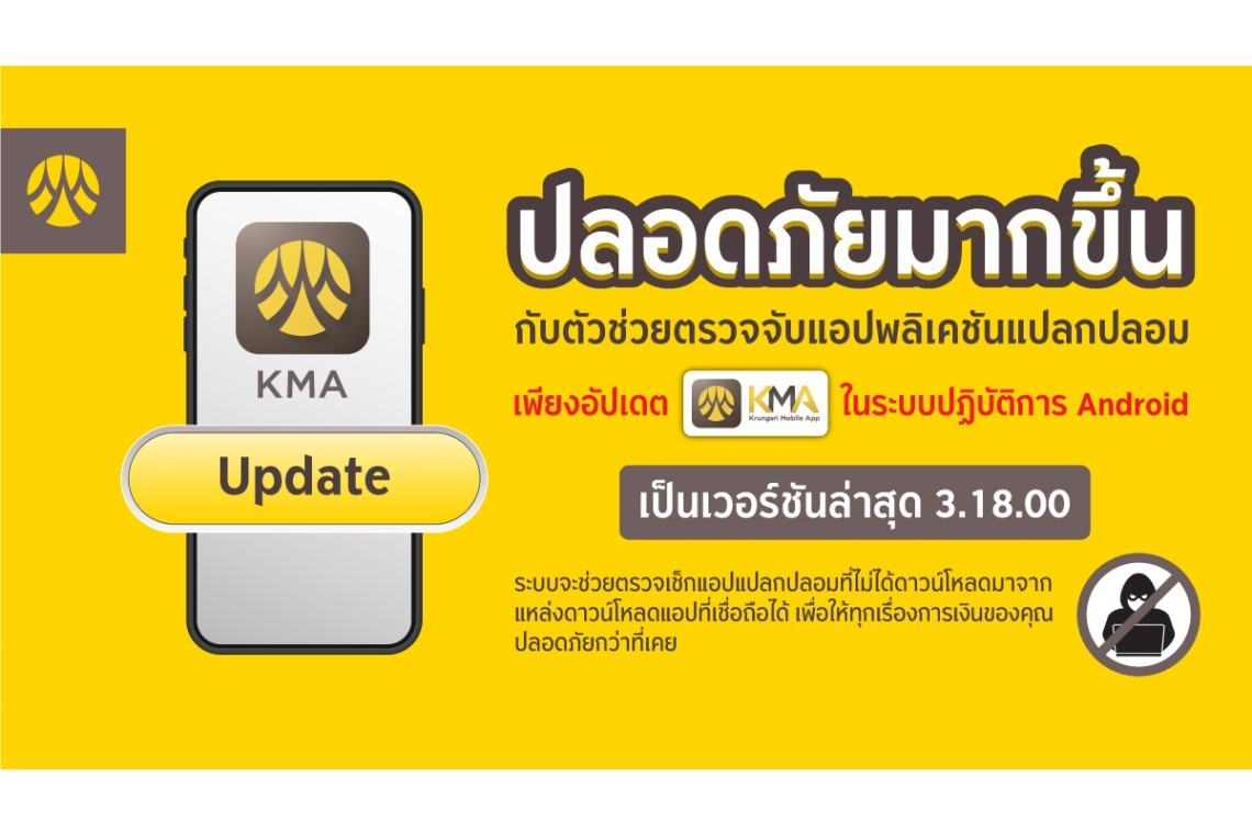 ธนาคารกรุงศรีอยุธยา จำกัด (มหาชน)ประกาศแจ้งลูกค้าผู้ใช้งาน KMA – Krungsri Mobile Application ผ่านระบบปฏิบัติการแอนดรอยด์ (Android) ให้ทำการอัปเดตเวอร์ชันล่าสุดเป็น 3.18.00 ซึ่งจะมาพร้อมตัวช่วยในการตรวจจับแอปแปลกปลอม เพื่อยกระดับมาตรฐานความปลอดภัยในการทำธุรกรรมต่างๆ ผ่านโมบายแอปพลิเคชัน