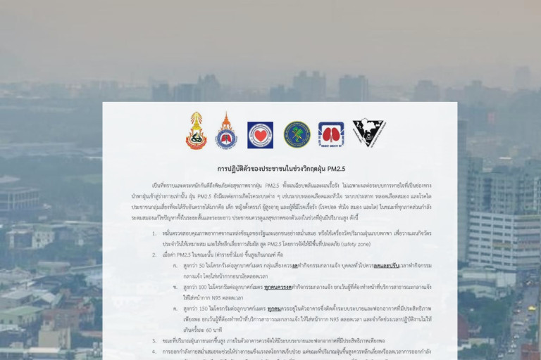 เมื่อวันที่ 10 มี.ค.66 ผู้สื่อข่าวรายงานว่า ราชวิทยาลัยอายุรแพทย์แห่งประเทศไทย ร่วมกับ 5 สมาคมวิชาชีพเวชกรรม นำโดย พล.ท.รศ.นพ.วิชัย ประยูรวิวัฒน์ ประธานราชวิทยาลัยอายุรแพทย์แห่งประเทศไทย รศ.นพ.แจ่มศักดิ์ ไชยคุนา นายกสมาคมอุรเวชช์แห่งประเทศไทยในพระบรมราชูปถัมภ์ รศ.นพ.สุพจน์ ศรีมหาโชตะ นายกสมาคมแพทย์โรคหัวใจแห่งประเทศไทยในพระบรมราชูปถัมภ์ แพทย์หญิงทัศนีย์ ตันติฤทธิศักดิ์ นายกสมาคมประสาทวิทยาแห่งประเทศไทย นพ.วุฒิเดช โอภาศเจริญสุข นายกสมาคมโรคไตแห่งประเทศไทย และ รศ.นพ.สัมมน โฉมฉาย นายกสมาคมพิษวิทยาคลินิก ได้ลงนามในประกาศ การปฏิบัติตัวของประชาชนในช่วงวิกฤติฝุ่น PM2.5 มีใจความสรุปว่า ..