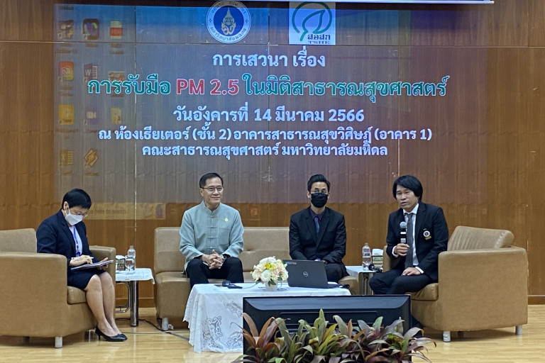 วันที่ 14 มี.ค.2566 คณะสาธารณสุขศาสตร์ มหาวิทยาลัยมหิดล ร่วมกับ สมาคมสถาบันอุดมศึกษาสิ่งแวดล้อมไทย จัดเสวนาเรื่อง รับมือPM2.5 ในมิติสาธารณสุขศาสตร์ โดยมี นายวีระศักดิ์ โควสุรัตน์ รองประธานคณะกรรมาธิการทรัพยากรธรรมชาติและสิ่งแวดล้อม วุฒิสภา ดร.ศักดา ตรีเดช ผู้อำนวยการส่วนนวัตกรรมคุณภาพอากาศและเสียง กรมควบคุมมลพิษผศ.ดร.เอื้อมพร มัชฌิมวงศ์ รองอธิการบดีฝ่ายการคลัง มหาวิทยาลัยมหิดล ผศ.ดร.สราวุธ เทพานนท์ คณบดีคณะสาธารณสุขศาสตร์ มหาวิทยาลัยมหิดล(ผู้ดำเนินรายการ) เข้าร่วม
