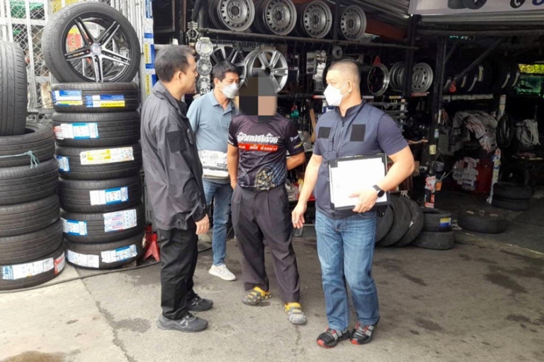 ก่อนการจับกุม ชุดปฏิบัติการศูนย์สืบสวนสะกดรอยและการข่าว กรมสอบสวนคดีพิเศษ ได้สืบทราบจากแหล่งข่าวและได้สะกดติดตาม จนทราบว่าผู้ต้องหารายนี้ประกอบธุรกิจเกี่ยวกับยางรถยนต์และล้อรถยนต์ ที่ถนนกัลปพฤกษ์ แขวงบางแค เขตบางแค กรุงเทพมหานคร จึงได้วางแผนลงพื้นที่ จนกระทั่งพบตัวผู้ต้องหารายดังกล่าว จากนั้นเจ้าหน้าที่ชุดสืบสวนได้แสดงตัวเป็นเจ้าพนักงานเข้าจับกุม แสดงหมายจับ แจ้งสิทธิตามกฎหมายให้ทราบ พร้อมทั้งแจ้งข้อกล่าวหาให้ทราบว่า ผู้ถูกจับต้องหาว่ากระทำความผิดฐาน ช่วยซ่อนเร้น ช่วยจำหน่าย ช่วยพาเอาไปเสีย ซื้อ รับจำนำ หรือรับไว้ โดยประการใดซึ่งอันตนรู้ว่าเป็นของต้องจำกัด หรือที่เข้ามาในราชอาณาจักร โดยยังมิได้ผ่านศุลกากร โดยถูกต้อง หรือเป็นของที่นำเข้ามาในราชอาณาจักรโดยหลีกเลี่ยงอากร ข้อจำกัดหรือข้อห้ามอันเกี่ยวแก่ของนั้น รวมทั้งเป็นความผิดฐานปลอมเอกสารราชการและใช้เอกสารปลอม จากนั้นได้ควบคุมตัวผู้ถูกจับ นำส่งพนักงานสอบสวนคดีพิเศษดำเนินการตามกฎหมายต่อไป