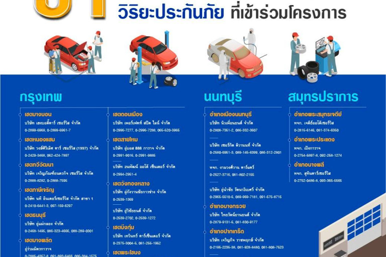 สำหรับศูนย์ซ่อมมาตรฐานวิริยะประกันภัยที่เข้าร่วมโครงการ จำนวน 31 แห่ง ได้แก่ 1. บริษัท เฮงบอดี้คาร์ เซอร์วิส จำกัด 2. บริษัท วงษ์ศิริเลิศ คาร์ เซอร์วิส (1997) จำกัด 3. บริษัท เจริญภัณฑ์ยนตรกิจ เซอร์วิส จำกัด 4. บริษัท นที อินเตอร์เซอร์วิส จำกัด สาขา 1 5. บริษัท อู่แม่กลอง จำกัด 6. อู่ร่วมมิตรการาจ 7. บริษัท เอส ซี ซี 65 การาจ จำกัด 8. บริษัท อ.พิพัฒน์ จำกัด 9. บริษัท คุงการาจ จำกัด 10. บริษัท เซอร์กิตบริการ จำกัด 11. บริษัท เพอร์เฟคท์ สปีด ไลน์ จำกัด 12. บริษัท อู่บอส 888 การาจ จำกัด 13. บริษัท ธนพัฒน์ ออโต้ เซ็นเตอร์ จำกัด 14. บริษัท อู่กังวานชัยการช่าง จำกัด 15. บริษัท อู่วิชัยยนต์ จำกัด 16. บริษัท เทวินทร์ คาร์เซ็นเตอร์ จำกัด 17. บริษัท อู่ เอส.เอส. อินเตอร์กรุ๊ป จำกัด 18. บริษัท เจ.เอส.อินเตอร์กรุ๊ป จำกัด 19. บริษัท รุ่งเจริญ บอดี้ คลีนิค จำกัด 20. บริษัท สุขุมวิท เอ.ที. เซอร์วิส 21. บริษัท นิวเพื่อนยนต์ จำกัด 22. บริษัท เซอร์กิต ติวานนท์ จำกัด 23. หจก.งามวงศ์วาน คาร์แคร์ 24. บริษัท อู่นำชัย รัตนาธิเบศร์ จำกัด 25. บริษัท ไทยรัตน์ยานยนต์ จำกัด 26. บริษัท เจริญกิจ ราชพฤกษ์ จำกัด 27. อู่นำชัย เตาปูน จำกัด 28. บริษัท เจริญกิจ ออโต้ เซอร์วิส จำกัด 29. หจก. เจดีย์ออโต้เซอร์วิส 30. หจก.เป้งการาจ 31. หจก.สุทินคาร์เซอร์วิส
