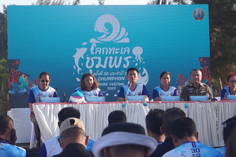 เมื่อเวลา 17.00 น.วันที่ 17 มี.ค. 66  ที่บริเวณรูปปั้นวัวกระทิง หาดทุ่งวัวแล่น ตำบลสะพลี อ.ปะทิว จ.ชุมพร นายวิสาห์ พูลศิริรัตน์ ผู้ว่าฯจ.ชุมพร  นางสาวกฤชสร ทรายแก้ว ผู้อำนวยการการท่องเที่ยวแห่งประเทศไทย สำนักงานชุมพร นางสมศรี หีมขาว ประธานชมรมร้านอาหารชุมพร นางสาวประดับ ชูดำพัฒนาการจังหวัดชุมพร  พ.ต.อ.นิรันดร์ กันจู รองผู้บังคับการตำรวจภูธรจังหวัดชุมพร ร่วมกันเปิดการแถลงข่าวเตรียมความพร้อมจัดงานเปิดโลกทะเลชุมพร ครั้งที่ 30  ระหว่างวันที่ 24 - 28 มีนาคม 2566 ณ บริเวณหาดทุ่งวัวแล่น ตำบลสะพลี อำเภอปะทิว จังหวัดชุมพร