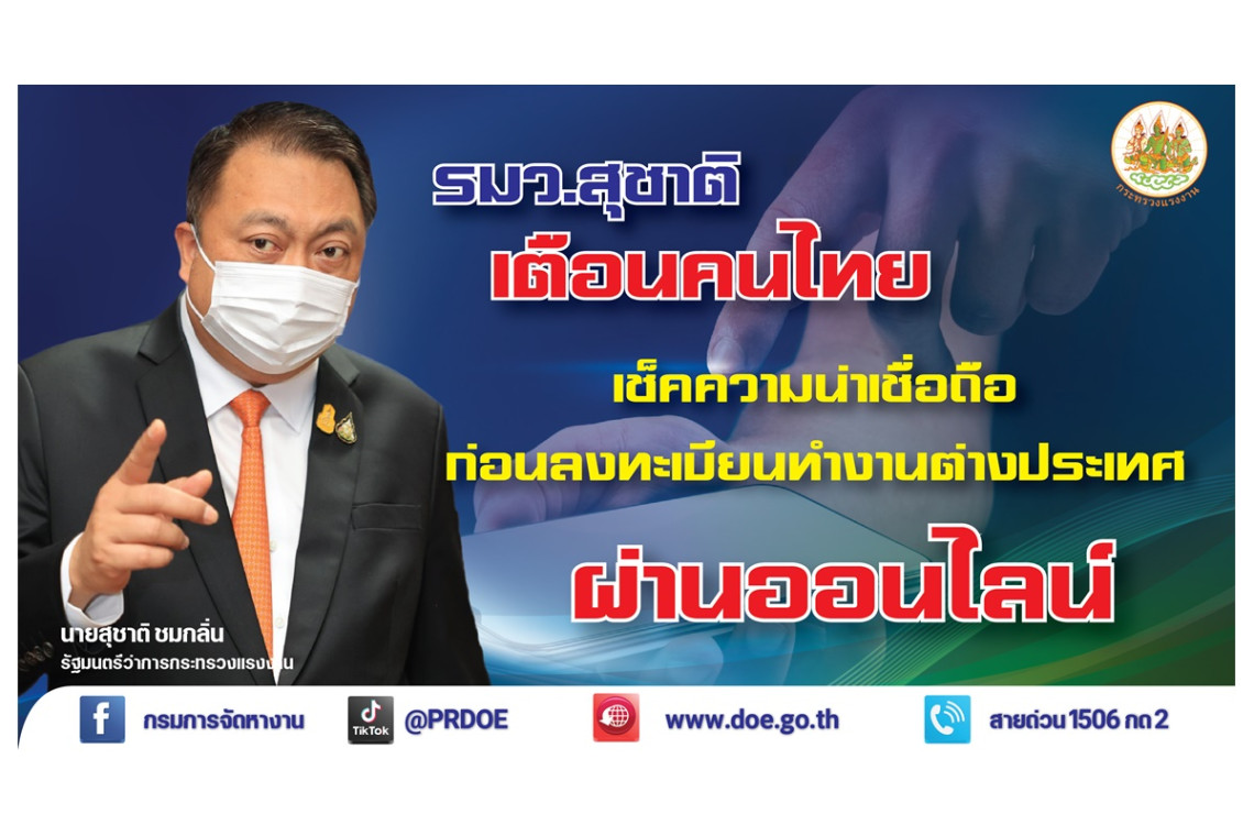 กระทรวงแรงงานห่วงคนไทยถูกหลอกรีดข้อมูลส่วนบุคคล เตือนตรวจสอบความน่าเชื่อถือแพลตฟอร์มรับลงทะเบียน ฝากประวัติหางานต่างประเทศออนไลน์ ก่อนสมัครใช้งาน