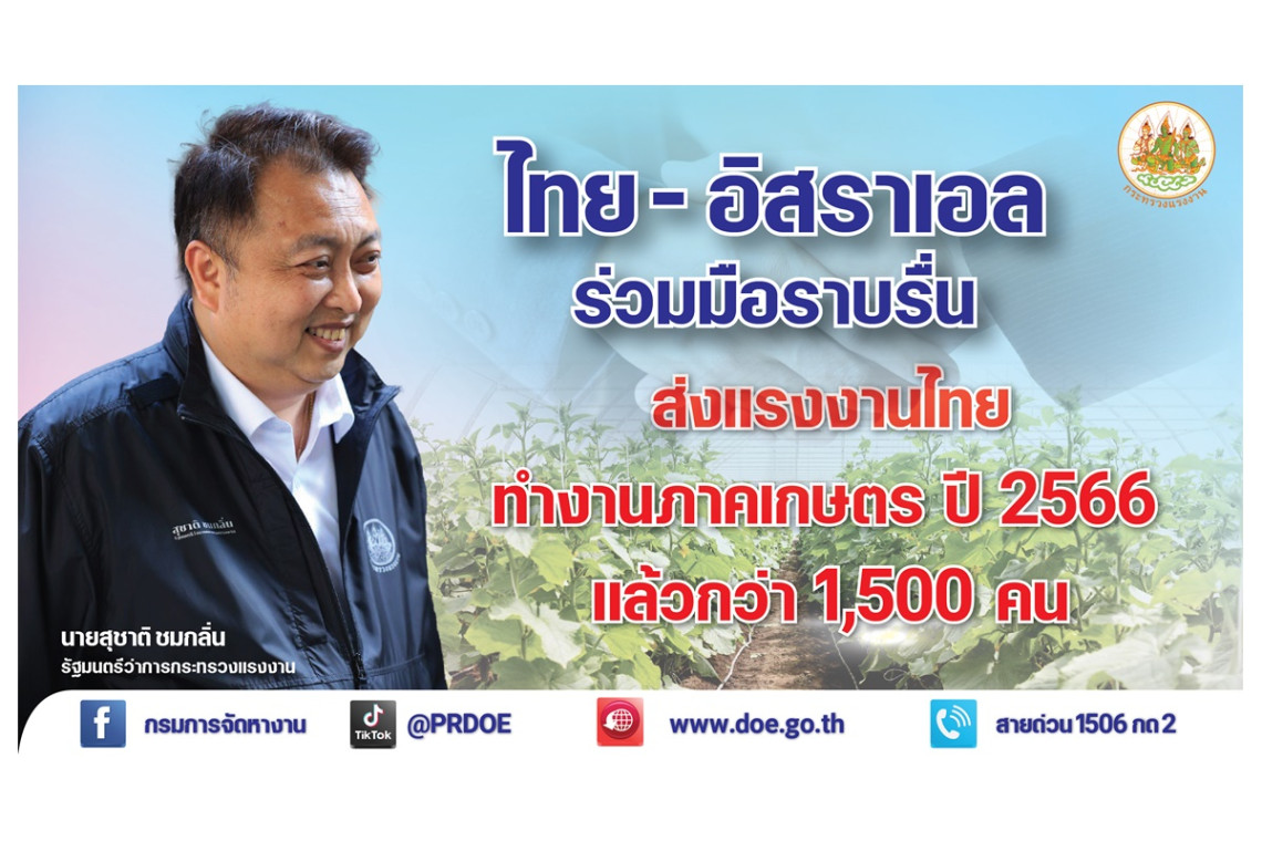 รมว.แรงงานเผยปี 66 โควตางานภาคเกษตรรัฐอิสราเอล 6,500 คน จัดส่งแล้ว 1,513 คน พร้อมปูทางขยายตลาดแรงงานภาคอุตสาหกรรมในอนาคต