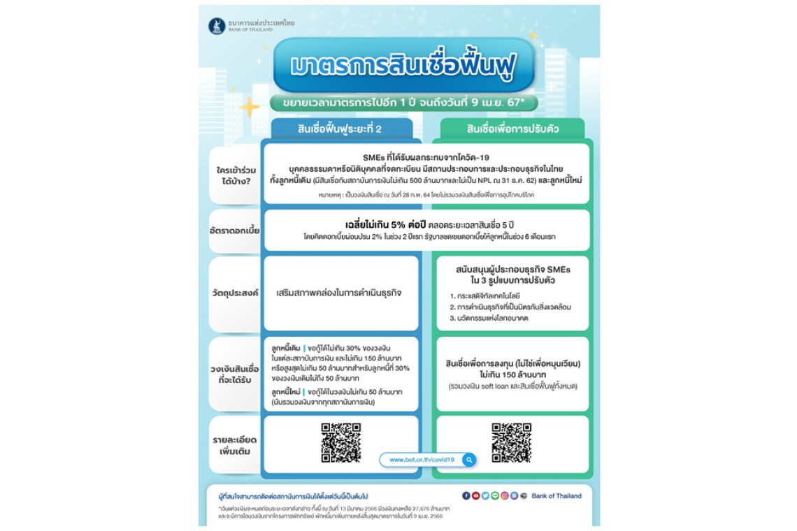 ธปท.ขยายอายุมาตรการสนับสนุนการให้สินเชื่อแก่ผู้ประกอบธุรกิจต่อไปอีก 1 ปี ให้ลูกหนี้ที่ได้รับผลกระทบจากโควิด-19 ได้รับความช่วยเหลือต่อเนื่อง เสริมสภาพคล่องให้กับธุรกิจ แต่ไม่ต่ออายุพักทรัพย์ พักหนี้