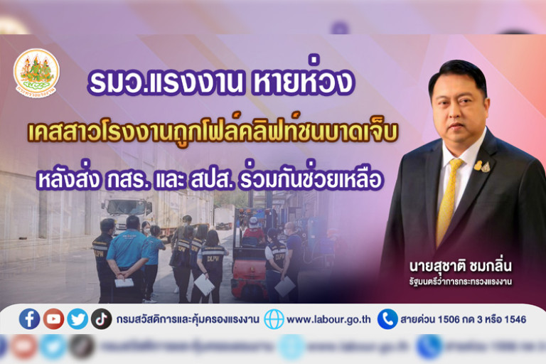 รัฐมนตรีว่าการกระทรวงแรงงานหายห่วง กรณีลูกจ้างสาวถูกโฟล์คลิฟท์ชนได้รับบาดเจ็บ หลังส่งกรมสวัสดิการและคุ้มครองแรงงาน และสำนักงานประกันสังคมลงพื้นที่ให้ความช่วยเหลือ พบได้รับการรักษา ได้รับค่าจ้างและไม่ได้ถูกเลิกจ้างตามข่าว
