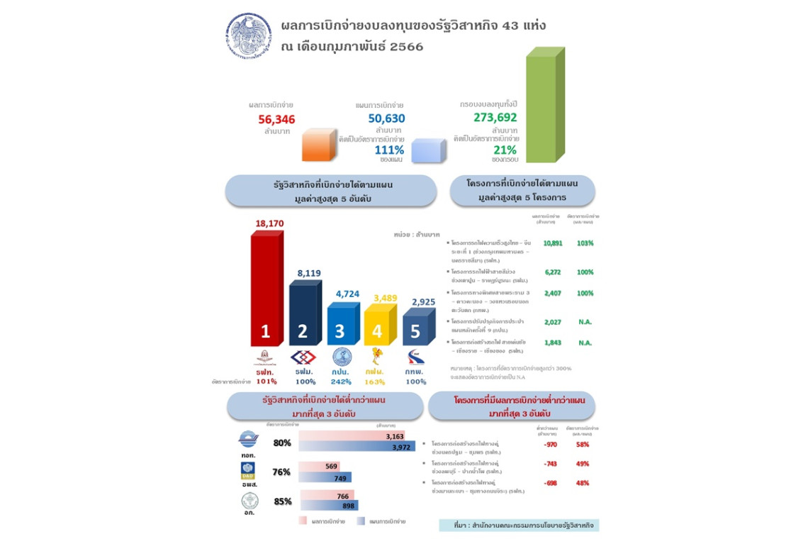 นางปานทิพย์ ศรีพิมล ผู้อำนวยการสำนักงานคณะกรรมการนโยบายรัฐวิสาหกิจ (สคร.) เปิดเผยว่า ในปี 2566 รัฐวิสาหกิจมีการเบิกจ่ายงบลงทุนจนถึงเดือนกุมภาพันธ์ 2566 จำนวน 56,346 ล้านบาท หรือคิดเป็นร้อยละ 111 ของแผนการเบิกจ่าย ประกอบด้วยการเบิกจ่ายงบลงทุนของรัฐวิสาหกิจปีงบประมาณ (ตั้งแต่เดือนตุลาคม 2565 - เดือนกุมภาพันธ์ 2566) 34 แห่ง จำนวน 43,524 ล้านบาท หรือคิดเป็นร้อยละ 107 ของแผนการเบิกจ่าย และรัฐวิสาหกิจปีปฏิทิน (เดือนมกราคม 2566 - เดือนกุมภาพันธ์ 2566) 9 แห่ง จำนวน 12,822 ล้านบาท หรือคิดเป็นร้อยละ 129 ของแผนการเบิกจ่าย