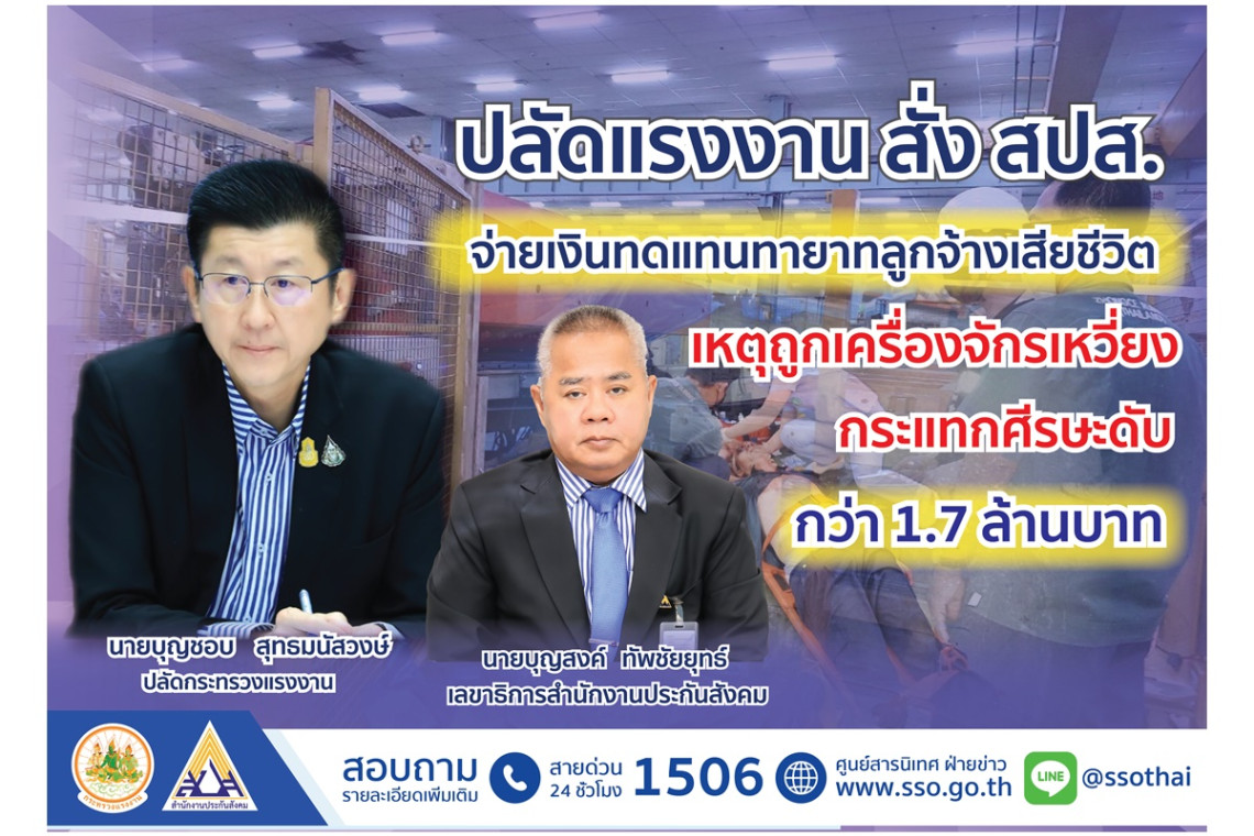 ปลัดแรงงาน สั่ง สปส.จ่ายเงินทดแทนทายาทลูกจ้างเสียชีวิต เหตุถูกเครื่องจักรเหวี่ยงกระแทกศีรษะดับ กว่า 1.7 ล้านบาท