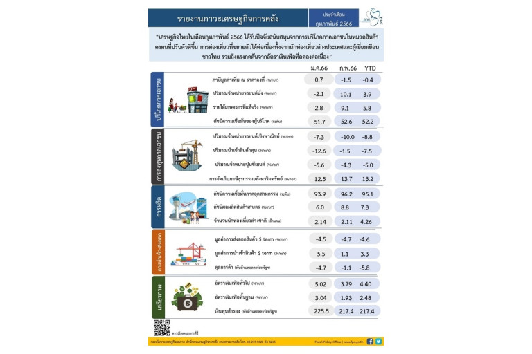 นายพรชัย ฐีระเวช ผู้อำนวยการสำนักงานเศรษฐกิจการคลัง (สศค.) เปิดเผยว่า เศรษฐกิจไทยในเดือนกุมภาพันธ์ 2566 ได้รับปัจจัยสนับสนุนจากการบริโภคภาคเอกชนในหมวดสินค้าคงทนที่ปรับตัวดีขึ้น การท่องเที่ยวที่ขยายตัวได้ต่อเนื่อง ทั้งจากนักท่องเที่ยวต่างประเทศและผู้เยี่ยมเยือนชาวไทย รวมถึงแรงกดดันจากอัตราเงินเฟ้อที่ลดลงต่อเนื่อง โดยเครื่องชี้เศรษฐกิจด้านการบริโภคภาคเอกชน ปรับตัวดีขึ้นจากเดือนก่อนหน้า โดยการบริโภคในหมวดสินค้าคงทน สะท้อนจากปริมาณการจำหน่ายรถยนต์นั่ง และปริมาณรถจักรยานยนต์จดทะเบียนใหม่ ในเดือนกุมภาพันธ์ 2566 เพิ่มขึ้นจากช่วงเดียวกันปีก่อนที่ 10.1% และ 9.8% ตามลำดับ และเพิ่มขึ้นเมื่อเทียบกับเดือนก่อนหน้าที่ 11.8% และ 4.0% ตามลำดับ ขณะที่รายได้เกษตรกรที่แท้จริง ในเดือนกุมภาพันธ์ 2566 ขยายตัวจากช่วงเดียวกันปีก่อนที่ 9.1%