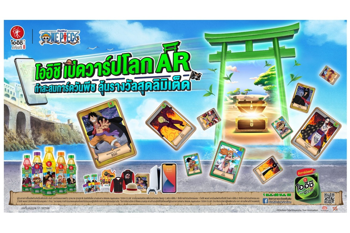 โออิชิ กรีนที ชวนสัมผัสประสบการณ์สุดล้ำ ครั้งแรกในไทย!! กับการเปิดตัว AR โลกเสมือนจริง ให้เหล่าสาวกวันพีซได้เข้าไปท่องโลกเสมือนจริงอย่างตื่นตาตื่นใจไปกับแคมเปญ “โออิชิเปิดวาร์ปโลก AR ท้าสะสมการ์ดวันพีซ” ผ่านแอปพลิเคชั่น “OISHI CLUB” อีกหนึ่งกิจกรรมรับหน้าร้อนจากโออิชิ ที่ให้แฟนๆวันพีซได้ร่วมตามล่าสะสมดิจิตอลการ์ดจากวันพีซกว่า 50 ลาย พร้อมลุ้นรางวัลสุดลิมิเต็ด อาทิ เซ็ทการ์ดสะสมลิมิเต็ดเอดิชั่นจาก โออิชิxวันพีซ, เสื้อแจ็คเก็ต, สแตนด์ดี้ อะครีลิค, บัตรโดยสารรถไฟฟ้าใต้ดิน และรางวัลโดนใจต่าง ๆ มากมาย ทั้งโทรศัพท์มือถือไอโฟน 14,เกมส์ Play Station 5 โดยสามารถร่วมกิจกรรมและลุ้นรางวัลง่ายๆ เพียงส่งรหัสใต้ฝาโออิชิผ่านแอปพลิเคชั่น OISHI CLUB ตั้งแต่วันที่ 1 เม.ย. ถึง 30 พ.ค.66