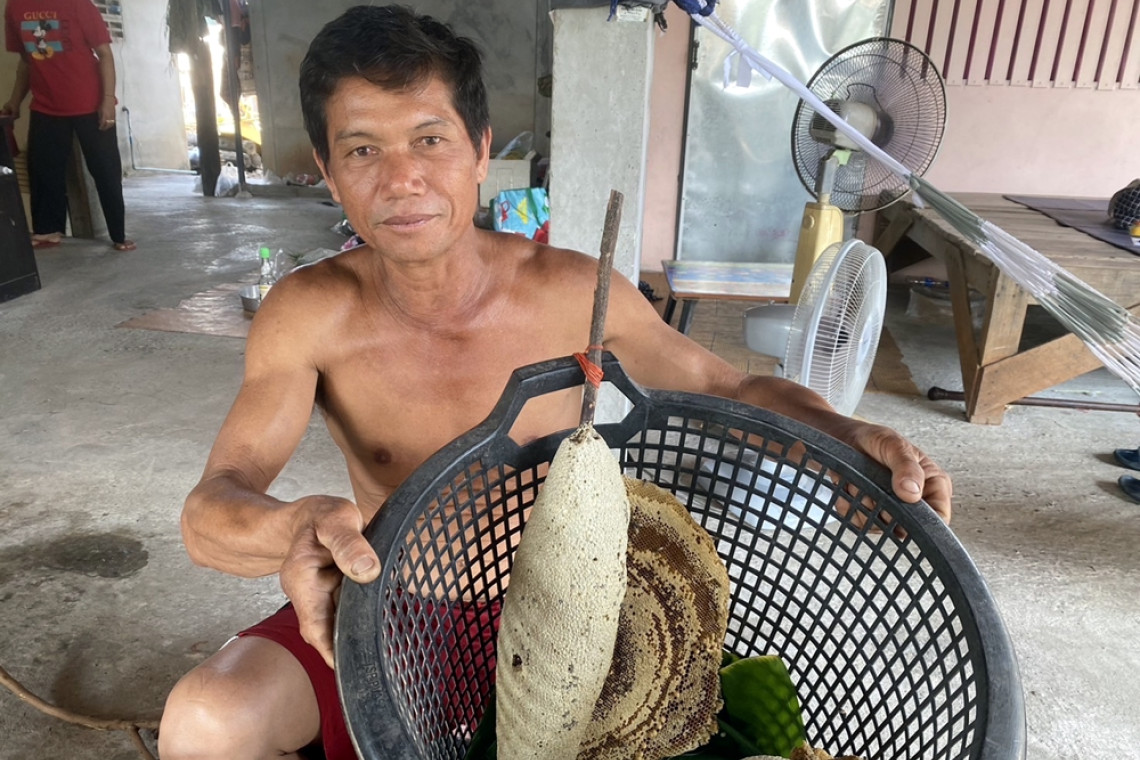 นายสันติ เล่าให้เราฟังว่า ตนเองได้ออกหาน้ำผึ้งมาตั้งแต่วัยเด็ก จนมาถึงปัจจุบันก็นานกว่า 40 ปีแล้ว แหล่งหาน้ำผึ้งส่วนใหญ่ก็จะเป็นทั้งในพื้นที่ และ บ้างครั้งก็ต้องเดินทางไปนอกพื้นที่บ้างในบางครั้ง วิธีที่นายสันติ ใช้ในการหาเอารังผึ้งกลับมาได้ ก็จะใช้วิธีการโดยนำกากมะพร้าวแห้ง มาจุดไฟเพื่อให้เกิดเป็นควัน ซึ่งยังบอกอีกว่า ผู้หารังผึ้งบางคนก็จะใช้วิธีสูบยาเส้นแล้วพ้นควันใส่รังผึ้ง แต่สำหรับนายสันติ บอกว่าตนเองเป็นคนที่ไม่สูบบุหรี่ หรือยาเส้น จึงใช้วิธีรมควันจากกากมะพร้าวแทน และวิธีนี้ยังเป็นการอนุรักษ์ให้ผึ้งยังคงมีชีวิตอยู่ต่อไปได้เพื่อผลิตรังผึ้งได้ต่อไป