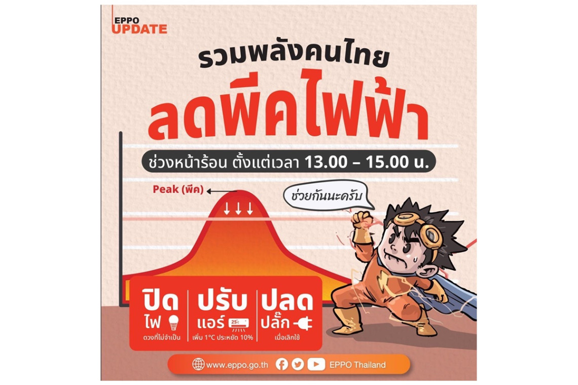 สำนักงานนโยบายและแผนพลังงาน (สนพ.) กระทรวงพลังงาน ระบุจากความต้องการใช้ไฟฟ้าในประเทศที่สูงขึ้นในช่วงหน้าร้อน ขอเชิญชวนประชาชนคนไทย รวมถึงหน่วยงานภาครัฐ ภาคเอกชน และผู้ประกอบการ ร่วมกันลดใช้ไฟฟ้าในช่วงหน้าร้อน เพื่อลดพีคไฟฟ้าของประเทศ โดยขอให้รวมพลังคนไทยลดพีคไฟฟ้าช่วงหน้าร้อน ตั้งแต่เวลา 13.00-15.00 น.ด้วยวิธีง่ายๆดังนี้ ปิดไฟและอุปกรณ์ไฟฟ้าที่ไม่ได้ใช้งาน, ปรับอุณหภูมิเครื่องปรับอากาศที่ 25 องศาฯ หรือปรับอุณหภูมิเพิ่ม 1 องศาฯ สามารถประหยัดไฟได้ถึง 10% และปลดปลั๊กอุปกรณ์ไฟฟ้าที่ไม่ได้ใช้งาน เพียงเท่านี้จะสามารถช่วยลดพีคไฟฟ้า ช่วยชาติประหยัดพลังงาน และยังช่วยประหยัดค่าไฟฟ้าในหน้าร้อนนี้ด้วย