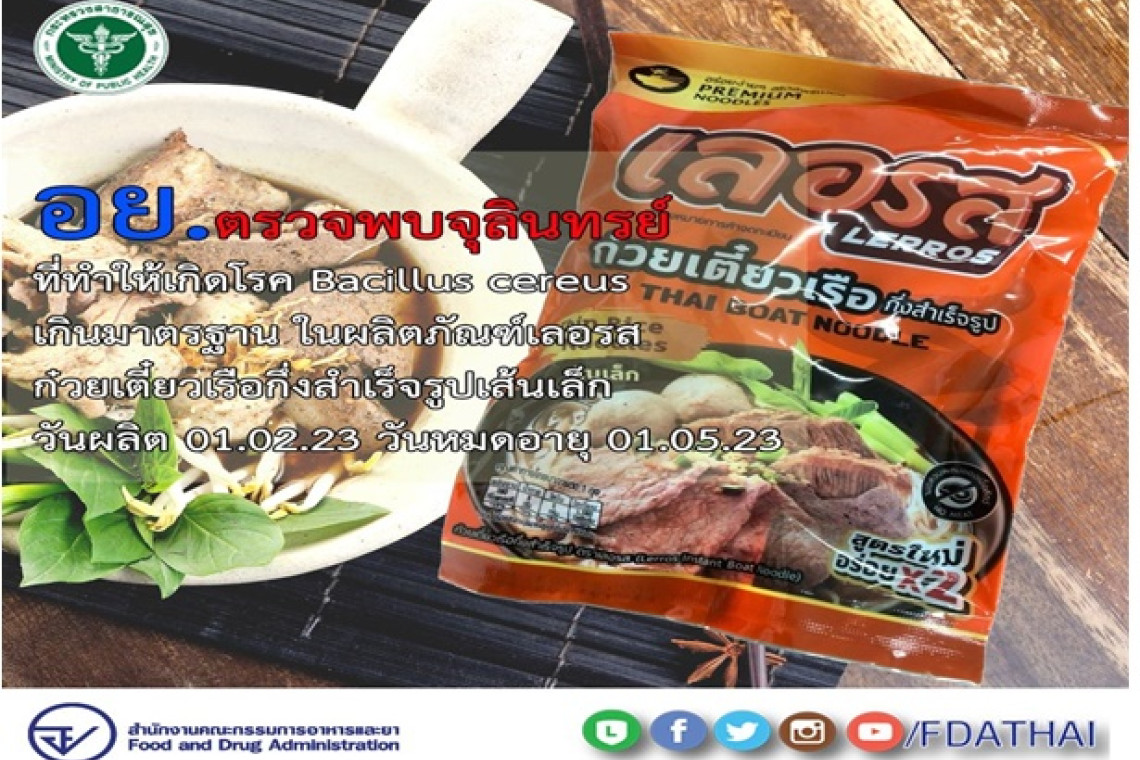 จัดจำหน่ายโดย : บริษัท เลอรส อินเตอร์ฟู้ดส์ จำกัด เลขที่ 408/6 หมู่ 7 ตำบลบางปูใหม่ อำเภอเมืองสมุทรปราการ จังหวัดสมุทรปราการ” จากสถานที่ผลิตอาหารเพื่อจำหน่าย ชื่อ ก๋วยเตี๋ยวเลอรส เมื่อวันที่ 1 ก.พ. 2566 ส่งตรวจวิเคราะห์กรมวิทยาศาสตร์การแพทย์ พบว่า เครื่องปรุงที่บรรจุในซองก๋วยเตี๋ยว มีการตรวจพบจุลินทรีย์ที่ทำให้เกิดโรค Bacillus cereus เท่ากับ 6,600 CFU/กรัม ไม่เป็นไปตามประกาศกระทรวงสาธารณสุข (ฉบับที่ 416) พ.ศ. 2563 แห่ง พ.ร.บ.อาหาร พ.ศ.2522 ที่กำหนดให้ตรวจพบ Bacillus cereus ในเครื่องปรุงที่บรรจุอยู่ในภาชนะบรรจุ ก๋วยเตี๋ยว ก๋วยจั๊บ บะหมี่ เส้นหมี่ และวุ้นเส้น ได้ไม่เกิน 1,000 CFU/กรัม จึงจัดเป็นอาหารผิดมาตรฐาน ขอเตือนผู้บริโภคให้ระมัดระวังอย่าซื้อผลิตภัณฑ์ดังกล่าว