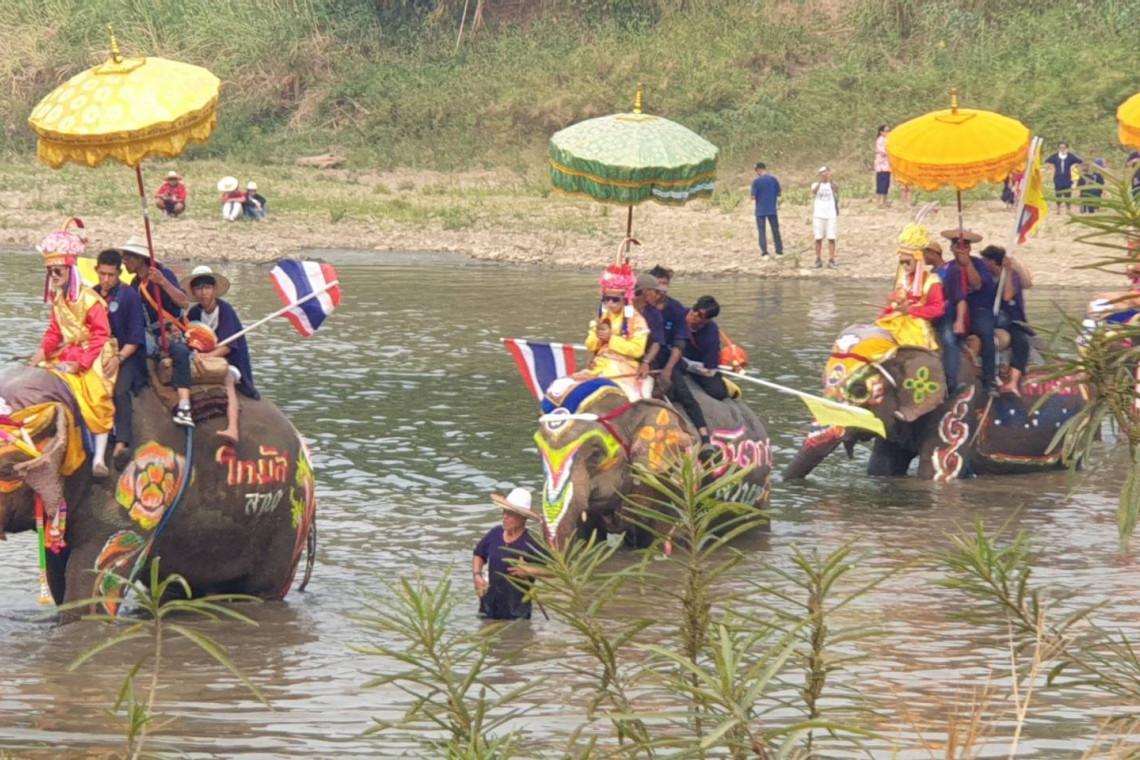 โดยมีขบวนแตรวงและกลองยาว บรรเลงเพลงให้กับผู้ร่วมขบวนได้ฟ้อนรำฉลองกั นอย่างสนุกสนานร่วมนับหลาย1,000 คน ส่วนไฮไล้น์ของงานจะอยู่ที่ จะมีการนำช้างเดินลงน้ำพร้อมนาคเป็นภาพที่สวยงามมีนักท่องเที่ยวชาวไทยและชาวต่างประเทศได้เดินทางมาท่องเที่ยวชมและถ่ายรูปเป็นที่ระลึกอีกด้วย งานประเพณีแห่ช้างบวชนาคชาวไทยพวนบ้านหาดเสี้ยวถือว่าเป็นงานประเพณีที่โด่งดังระดับโลก ทำให้นักท่องเที่ยวชาวไทยและชาวต่างประเทศให้ความสนใจเป็นอย่างมากเป็นการกระตุ้นเศรษฐกิจการท่องเที่ยวการค้าขายในอำเภอศรีสัชนาลัย จังหวัดสุโขทัยเป็นอย่างดี