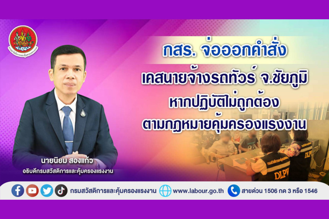 กรมสวัสดิการและคุ้มครองแรงงานเรียกสอบนายจ้างรถทัวร์ จ.ชัยภูมิ ปมให้ลูกจ้างขับรถเกินเวลาที่กฎหมายกำหนด พร้อมตรวจสอบสภาพการจ้าง การทำงาน หากพบปฏิบัติไม่ถูกต้องตามพระราชบัญญัติคุ้มครองแรงงาน พ.ศ.2541  ออกคำสั่งทันที