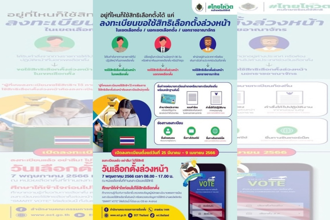 วันที่ 9 เม.ย.66 สำนักงานคณะกรรมการการเลือกตั้ง (กกต.) ขอเชิญผู้มีสิทธิเลือกตั้งที่ประสงค์ลงคะแนนเลือกตั้ง ส.ส.ล่วงหน้าในเขต นอกเขตเลือกตั้ง และนอกราขอาณาจักร สามารถยื่นคำขอลงทะเบียนใช้สิทธิลงคะแนนก่อนวันเลือกตั้งนอกเขตเลือกตั้ง ในเขตเลือกตั้ง และนอกราชอาณาจักร ตั้งแต่วันที่ 25 มีนาคม-9 เมษายน 2566 โดยกำหนดวันลงคะแนนเลือกตั้ง ส.ส. ล่วงหน้าทั้งในเขตและนอกเขตเลือกตั้งในวันอาทิตย์ที่ 7 พฤษภาคม 2566 เวลา 08.00-17.00 น. ซึ่งสามารถลงทะเบียนเลือกตั้งล่วงหน้านอกเขตเลือกตั้ง โดยมี 3 ช่องทาง