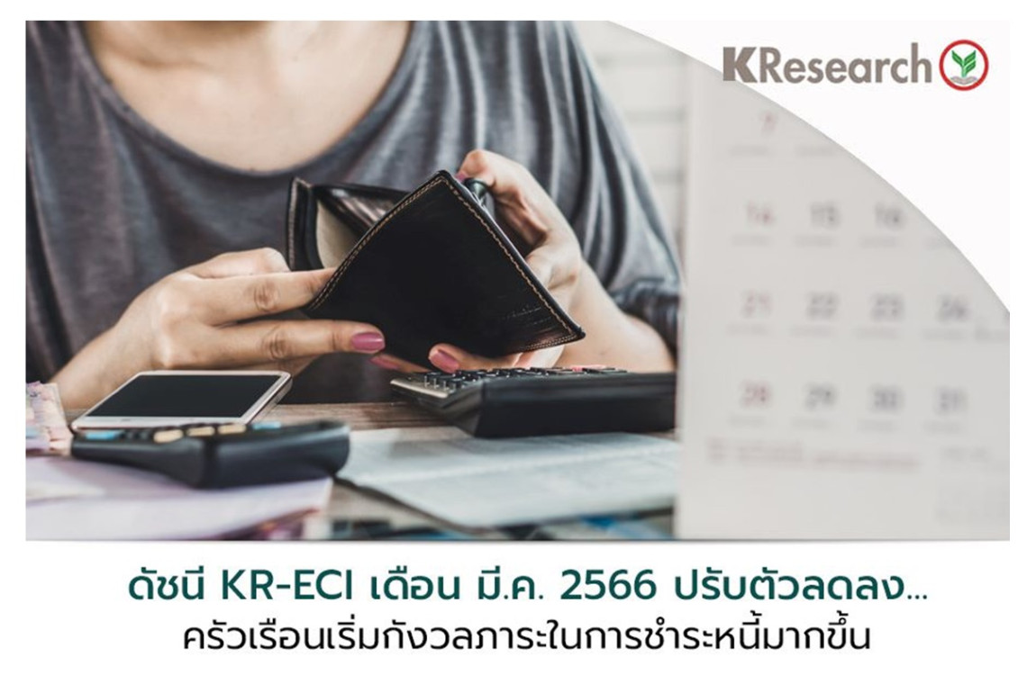 ศูนย์วิจัยกสิกรไทย รายงานว่า ในเดือนมี.ค. 66 ท่ามกลางทิศทางดอกเบี้ยขาขึ้นในปัจจุบัน ส่งผลให้เริ่มเห็นความกังวลที่มากขึ้นของครัวเรือน เกี่ยวกับภาระหนี้สิน โดยสะท้อนผ่านองค์ประกอบดัชนีภาวะเศรษฐกิจและการครองชีพของครัวเรือน (KR-ECI) ด้านภาระในการชำระหนี้ของครัวเรือนในเดือนนี้ลดลง (กังวลเพิ่มขึ้น) อย่างมีนัยสำคัญที่ 42.3 จาก 46.8 ในเดือนก.พ.66