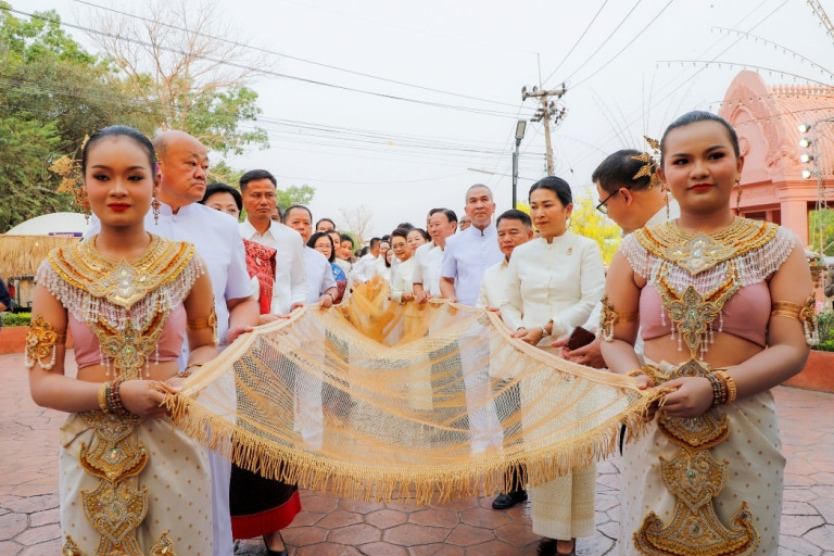 วันนี้ (12 เม.ย. 66) นายไชยวัฒน์ จุนถิระพงศ์ ผู้ว่าราชการจังหวัดบุรีรัมย์ พร้อมด้วยนางกัญญา จุนถิระพงศ์ นายกเหล่ากาชาดจังหวัด หัวหน้าส่วนราชการ และพุทธศาสนิกชนจำนวนมาก พร้อมใจกันแห่ผ้าอังสะเปลี่ยนให้องค์พระสุภัทรพิตร พระพุทธรูปคู่บ้านคู่เมืองบุรีรัมย์ ซึ่งตั้งอยู่สูงสง่า บนปากปล่องภูเขาไฟกระโดง พร้อมสรงน้ำพระพุทธรูปประจำวันเกิด ความเป็นสิริมงคลแก่ตนเองและครอบครัว เนื่องในเทศกาลสงกรานต์ พ.ศ.2566 พร้อมประกอบพิธีบวงสรวงสิ่งศักดิ์สิทธิ์ และรำบวงสรวง ถวายองค์พระสุภัทรพิตร ก่อนจัด “งานเทศกาลภูเขาไฟกระโดง” ประจำปี 2566