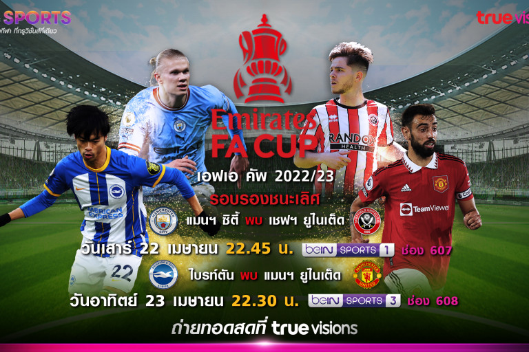 ทรูวิชั่นส์ ตอกย้ำการเป็นผู้นำคอนเทนต์กีฬาระดับโลก กับการถ่ายทอดสดศึกฟุตบอลถ้วยรายการที่เก่าแก่ที่สุดในโลก เอฟเอ คัพ 2022/23 รอบรองชนะเลิศ ที่สนามเวมบลีย์ กรุงลอนดอน ประเทศอังกฤษ แมนเชสเตอร์ ซิตี้ ปะทะ เชฟฟิลด์ ยูไนเต็ด วันเสาร์ที่ 22 เมษายนนี้ ทางทรูวิชั่นส์ ช่อง beIN Sports 1 (607) เวลา 22.45 น. และ ไบรท์ตัน พบ แมนเชสเตอร์ ยูไนเต็ด ในวันอาทิตย์ที่ 23 เมษายน เวลา 22.30 น. ทางทรูวิชั่นส์ ช่อง beIN Sports 3 (608)