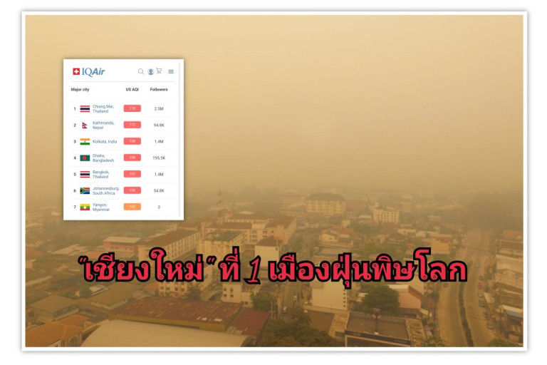 เมื่อวันที่ 18 เม.ย.66 จากการรายงานของเว็บไซต์ www.iqair.com ซึ่งรายงานคุณภาพอากาศและจัดอันดับเมืองมลพิษโลก โดยรายงานแบบเรียลไทม์ วันที่ 18 เม.ย.2566 เวลา 13.00 น.เชียงใหม่ ติดอันดับที่ 1 ของโลก โดยดัชนีคุณภาพอากาศอยู่ที่ 176 US AQI และกรุงเทพมหานคร (กทม.) อยู่ในอันดับที่ 5 โดยดัชนีคุณภาพอากาศอยู่ที่ 157 US AQI