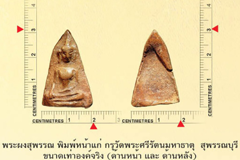 พระผงสุพรรณ พบที่ พระปรางค์ประธาน วัดพระศรีรัตนมหาธาตุ จ.สุพรรณบุรี โดย ชาวจีนซึ่งปีนเนินฐานองค์ปรางค์ขึ้นไปเพื่อปลูกผัก แล้วเห็นเป็นโพรงทะลุลงไป และยังพบพระประเภทอื่นอีก อาทิ พระปทุมมาศ พระกำแพงศอก พระกำแพงคืบ พระกำแพงนิ้ว ฯลฯ จนในราวปี พ.ศ.2456 ทางราชการ นำโดย สมเด็จกรมพระยาดำรงราชานุภาพ เสาะหาที่ตั้งของเจดีย์ยุทธหัตถี ครานั้น พระยาสุนทรบุรี (อี้ กรรณสูตร) เจ้าเมืองสุพรรณบุรีขณะนั้น จึงได้พบองค์พระปรางค์ ปรากฏว่ามีจารึกลานทองบางส่วนถูกขโมยไปและได้คืนมาบ้าง นอกจากนี้ยังได้มีการถวาย ‘พระผงสุพรรณ’ รวมทั้งพระในกรุแด่พระบาทสมเด็จพระมงกุฎเกล้าเจ้าอยู่หัว ซึ่งพระองค์ทรงแจกบางส่วนแก่ข้าราชบริพารผู้ติดตาม พระผงสุพรรณ จึงอยู่ในมือตระกูลราชการเก่าๆ ด้วยส่วนหนึ่ง