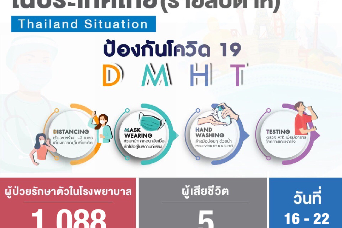 เมื่อวันที่ 24 เม.ย.66 เพจเฟซบุ๊ก กรมควบคุมโรค กระทรวงสาธารณสุข โพสต์ข้อความ ระบุว่า สถานการณ์ผู้ติดเชื้อโควิด 19 รายสัปดาห์ ระหว่างวันที่ 16 - 22 เม.ย.2566 ผู้ป่วยรักษาตัวในโรงพยาบาล (รายสัปดาห์) จำนวน 1,088 ราย : เฉลี่ยรายวัน จำนวน 155 ราย/วัน ผู้เสียชีวิต (รายสัปดาห์) จำนวน 5 ราย : เฉลี่ยรายวัน จำนวน 1 ราย/วัน