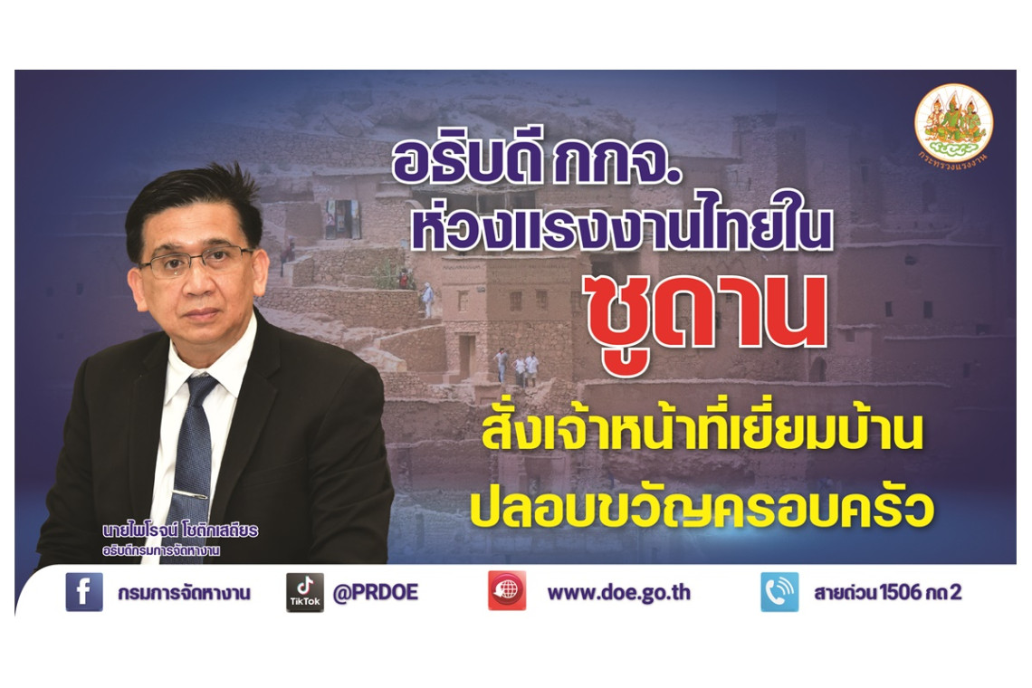 ทั้งนี้หากแรงงานหรือญาติที่ได้รับผลกระทบจากสถานการณ์ความไม่สงบในซูดานและต้องการความช่วยเหลือด้านแรงงานสามารถสอบถามเพิ่มเติมได้ที่สำนักงานจัดหางานจังหวัดทุกจังหวัด หรือโทรสายด่วนกระทรวงแรงงาน 1506 กด 2 กรมการจัดหางาน