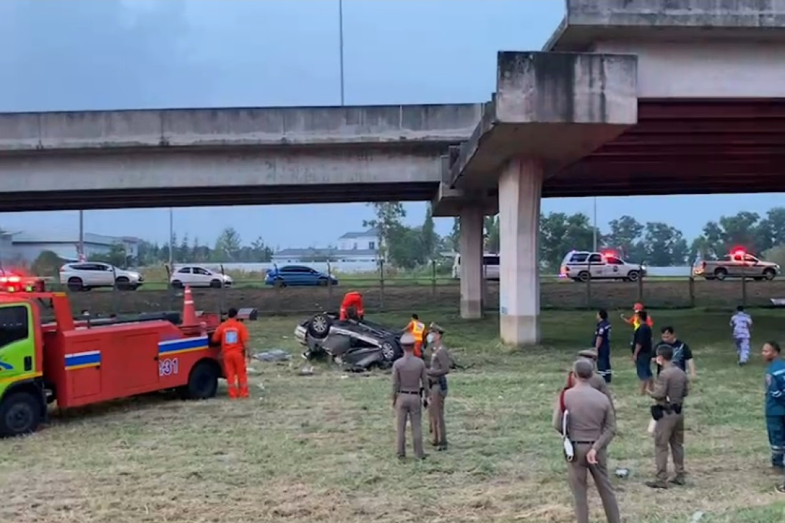 จึงรุดไปตรวจสอบที่เกิดเหตุ บริเวณทางพิเศษฉลองรัช ช่วงทางขึ้นถนนจตุโชติ พบรถยนต์ฮอนด้า ซิตี้ สีเทา ทะเบียน 2 กช 1579 กรุงเทพมหานคร เสียหลักตกลงมาจากทางด่วนในสภาพรถตีลังกา ล้อชี้ฟ้า พังยับเยิน และมีคนติดอยู่ในรถเป็นหญิงสาว 2 คน เจ้าหน้าที่ป่อเต็กตึ๊งต้องใช้อุปกรณ์เครื่องตัดถ่างงัดประตูออกจึงนำคนเจ็บ 2 คน ออกมาได้