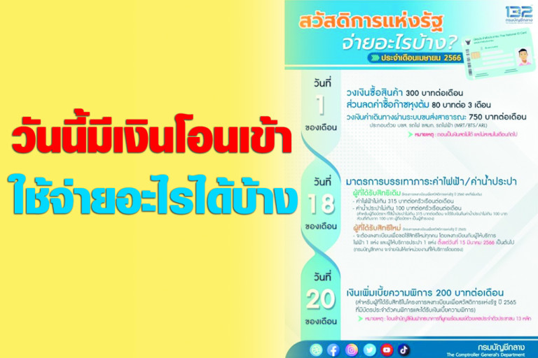 กรมบัญชีกลาง กระทรวงการคลัง ได้โอนเงินโครงการลงทะเบียนเพื่อสวัสดิการแห่งรัฐปี 2565 ให้ผู้ถือบัตรสวัสดิการแห่งรัฐ ซึ่งในเดือนพ.ค.66 ถือเป็นงวดที่สองให้กับผู้ลงทะเบียนรอบใหม่ที่ผ่านเกณฑ์และยืนยันตัวตนสำเร็จกว่า 13 ล้านราย โดยจะได้รับวงเงินดังนี้